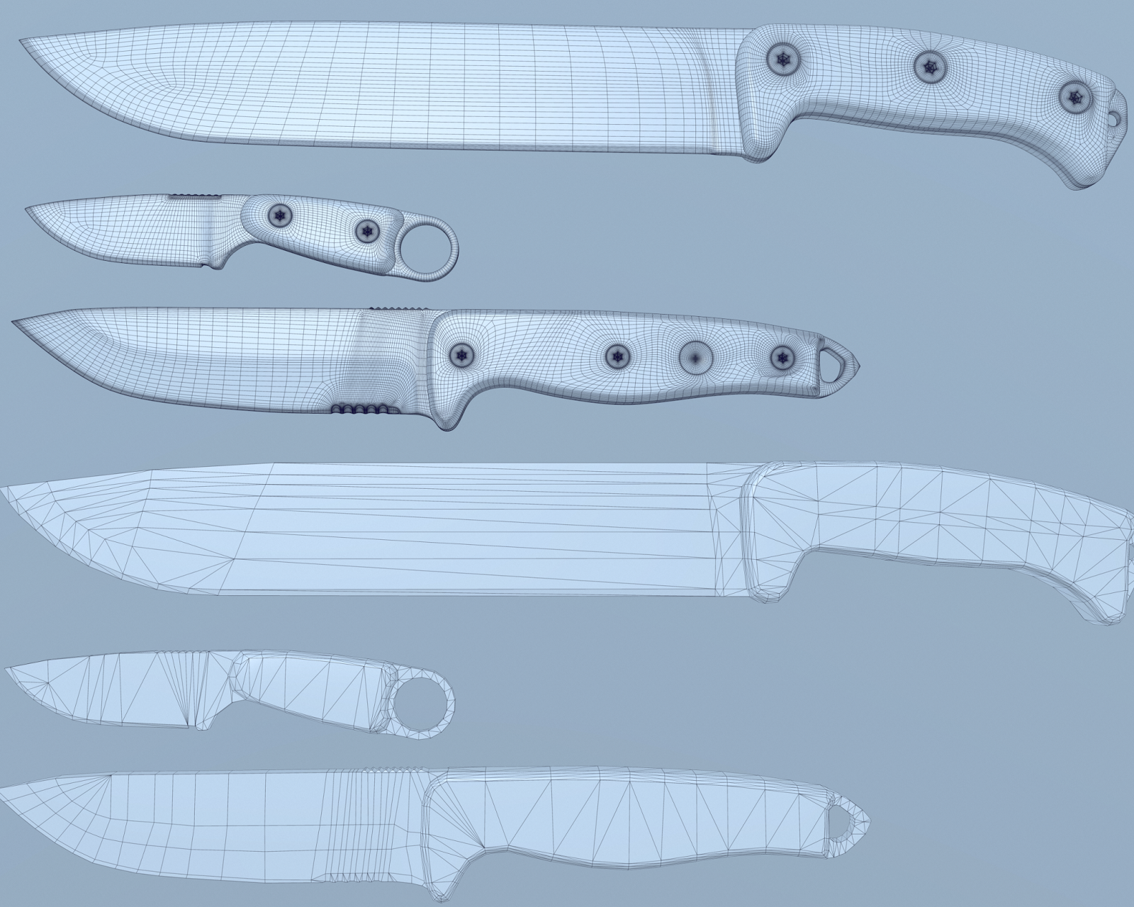 test viewer: https://www.artstation.com/artwork/QaaN8 had these knives for years, my backpacking/"bushcraft" knives. enormous sentimental value for me. wanted to learn Substance, so I modeled them and I want to get them pretty enough for the ol' portfolio.