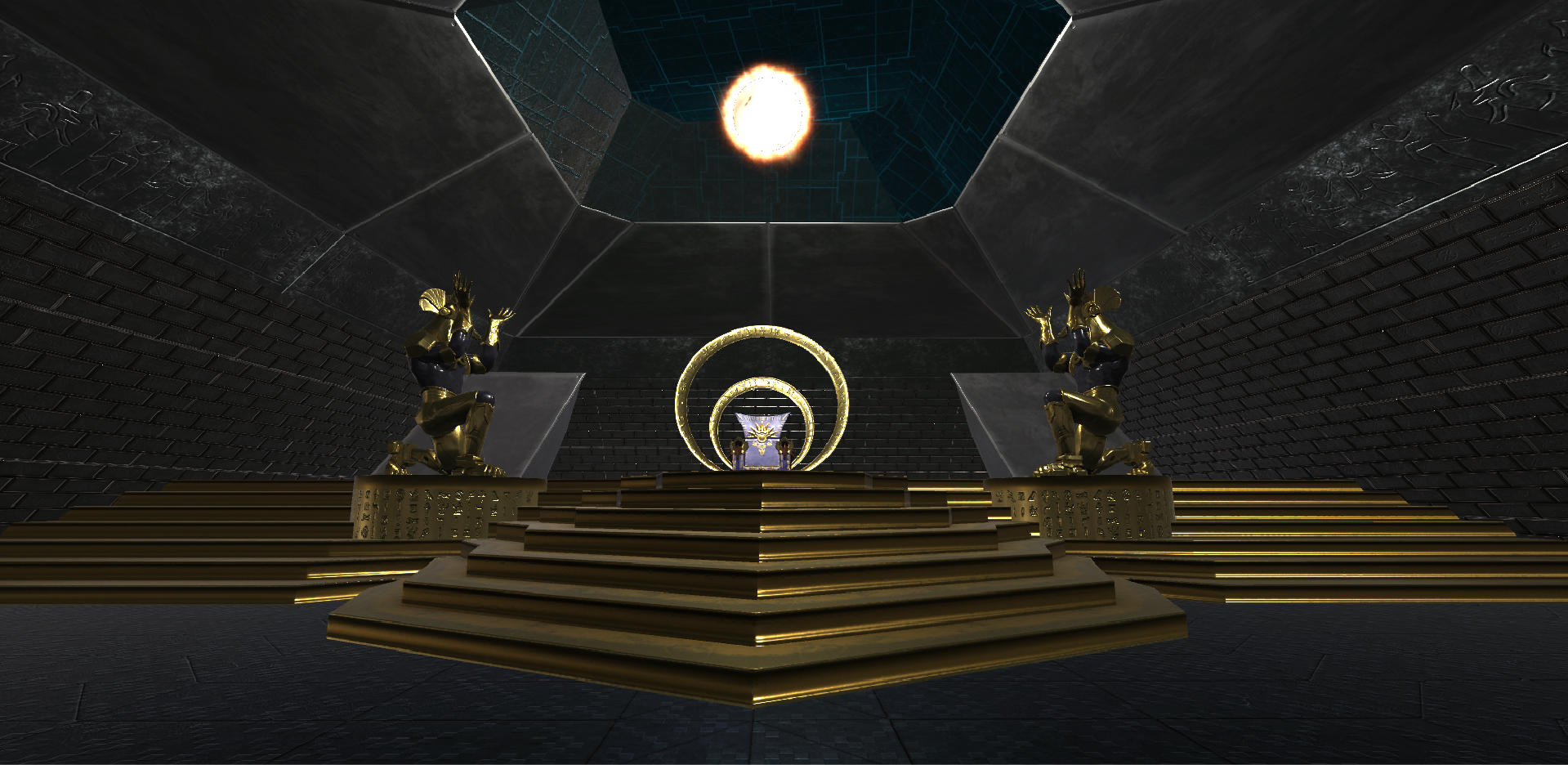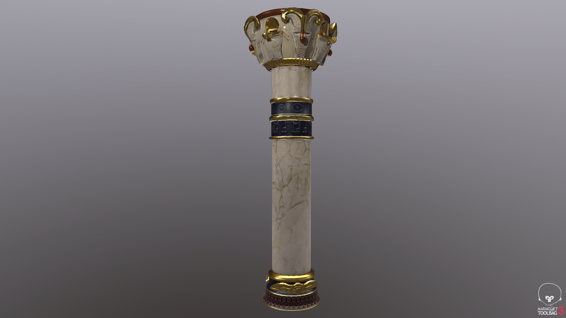 The only criticism I can come up with is that the textures look a bit flat but that could be because of the renderer. If not then I'd suggest adding some variation or imperfections to your stone/metal work. The anubis statue the body and the gold is shiny and perfect like a mirror all over and so is the marble on the pillar.