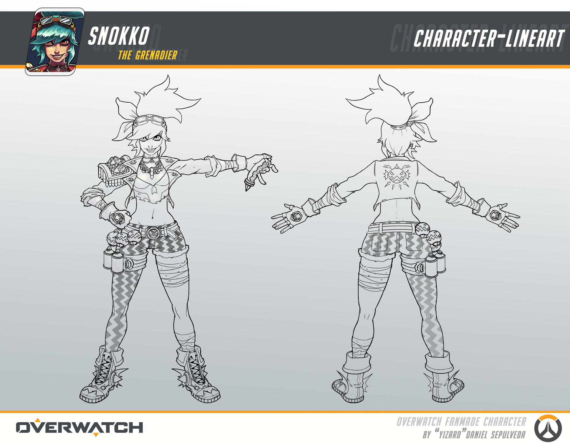 For those who may know the game well, looking at the style of her clothes, shape language and her colour scheme, she looks very much like a Junker-turned-Talon character. There's a lot of triangular motifs that give the sense of her being a very dangerous and almost wild hero. The worn parts of her clothing, hand-painted grenades and bandages feel very make-do-and-mend-ish, a lot like the elements found on Junkrat and Roadhog.