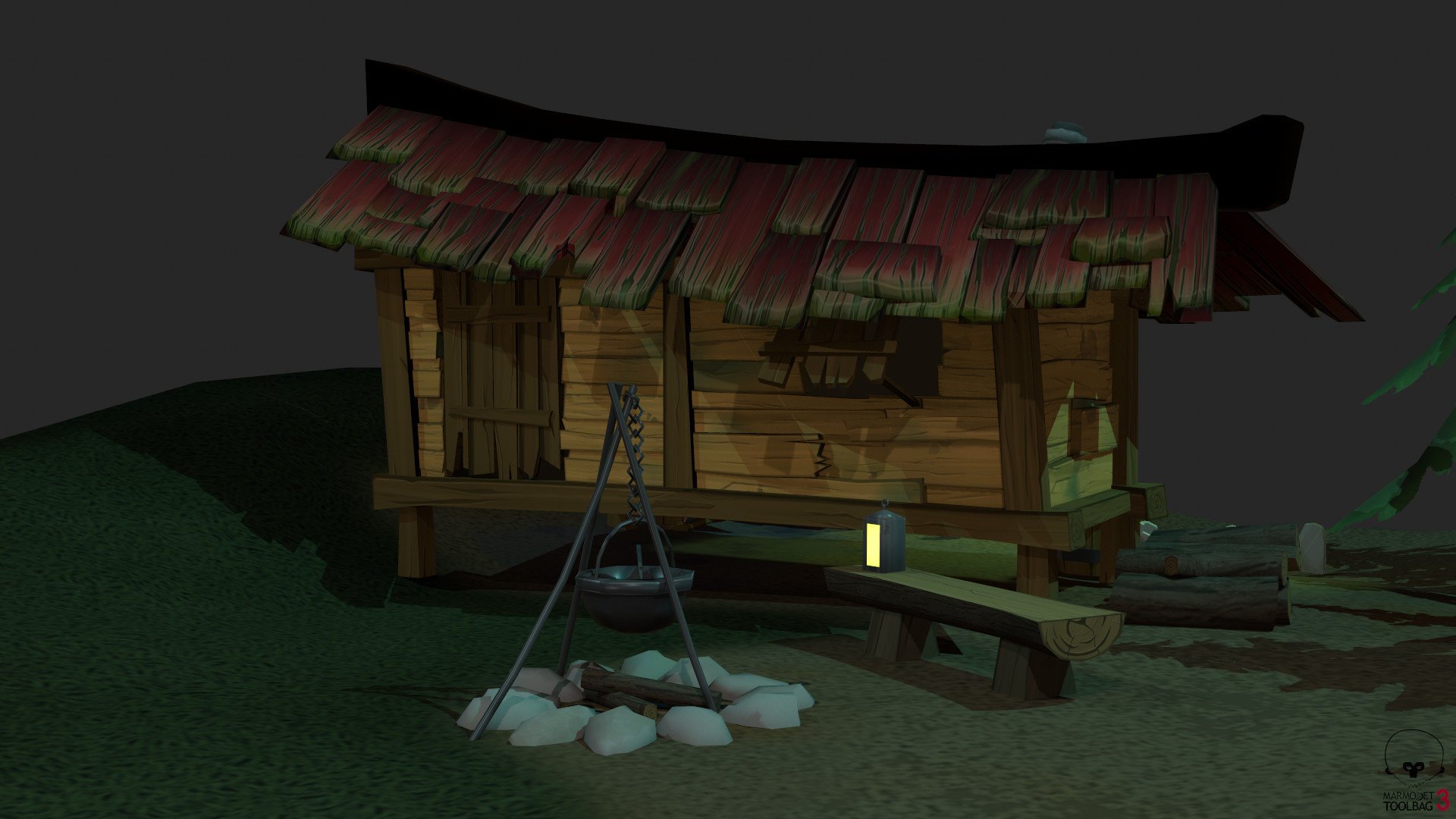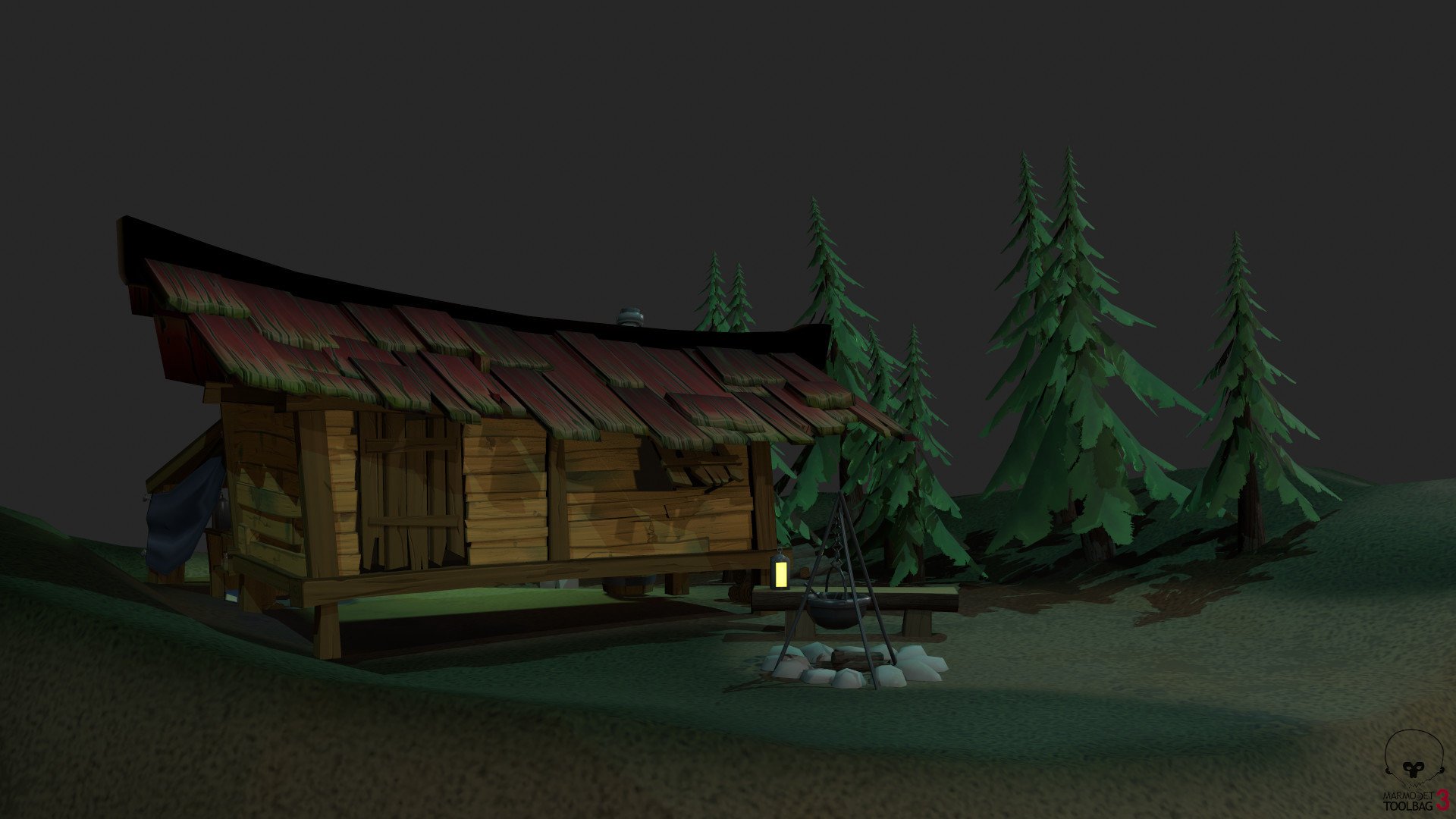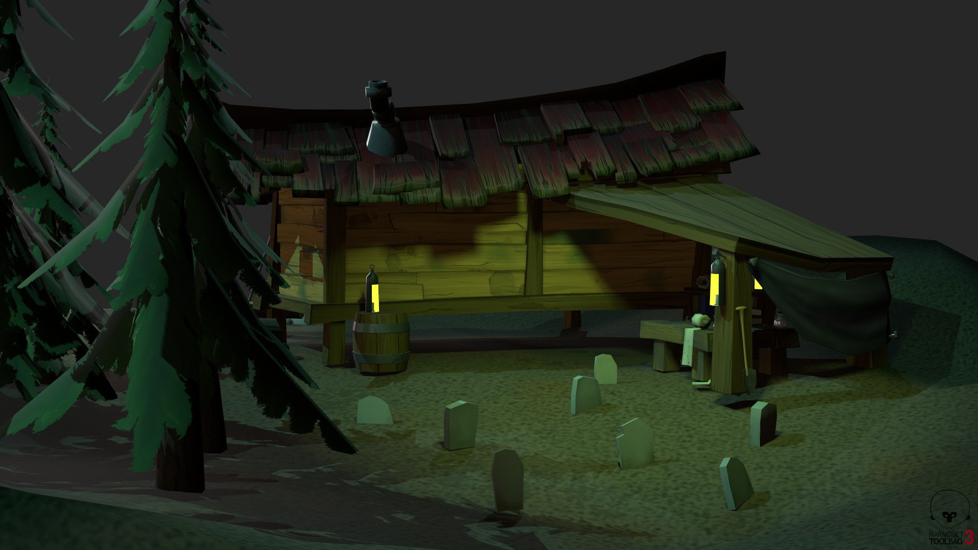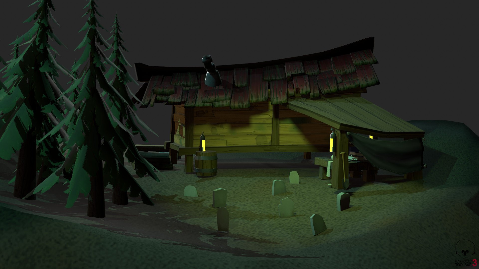 The main idea behind the piece is that the character living here wants to seem like a normal, simple forest dweller, but in reality, they're really into some dark necromancer stuff. The front of the hut needs to seem normal and quaint, but once the player/viewer explores the back, the set needs to show the characters true interests.