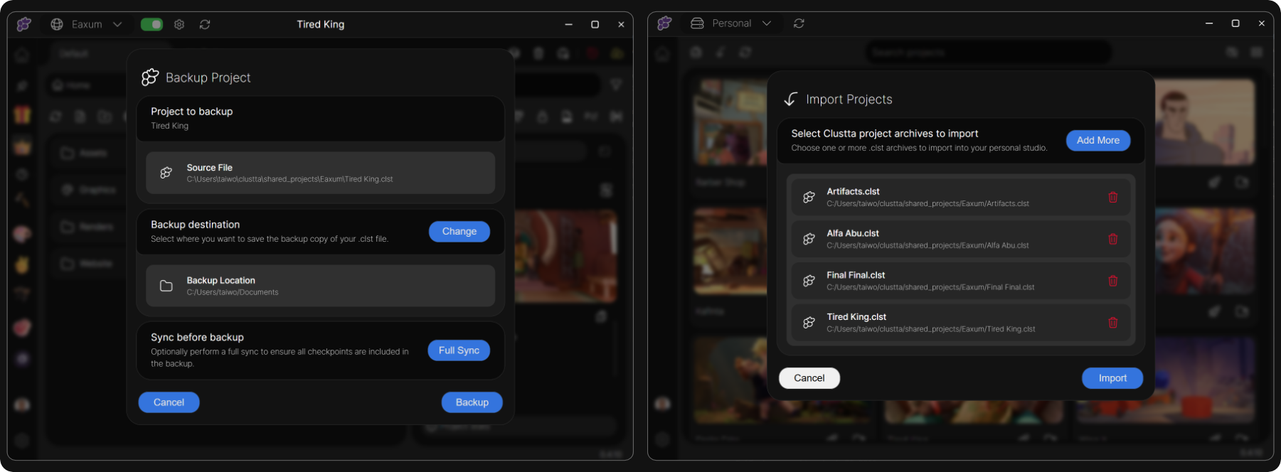 The '.clst' archives are similar to '.svn' or '.git' folders only in this case, it's a 'portable' SQliteDB. You can set this to anywhere you want as long as it's accessible by the file system. Deleting the .clst files wont delete your project files, only the metadata and checkpoints you created along the way. If you have versioned/tracked all of your project assets in Clustta, then it's essentially compressed and stored in the '.clst' archive and you can easily backup and or import it for example whenever you switch machines/Hard drives etc.