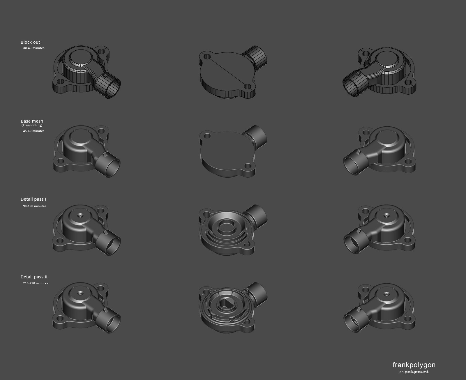 Working through an iterative block out process makes it a lot easier to resolve major shape and topology issues before investing a lot of time into any specific part of the mesh. Sometimes it's necessary to make compromises on the accuracy of the shapes and the surface quality but it's still possible to generate usable results quickly. Streamlining the modeling process and using parametric primitives or modifiers to control the different shapes will make it a lot easier to experiment with different density and topology strategies.