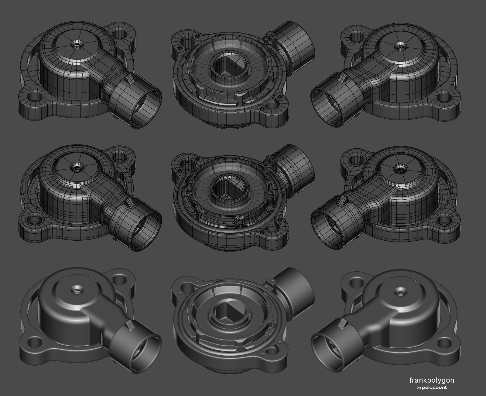 Detail pass II and final high poly. Continued refinement with smaller and smaller details. Some additional parts were also added to fill in the underside of the model. Improved segment matching leads to more consistent topology flow, especially around the top and bottom of the mounting flange.