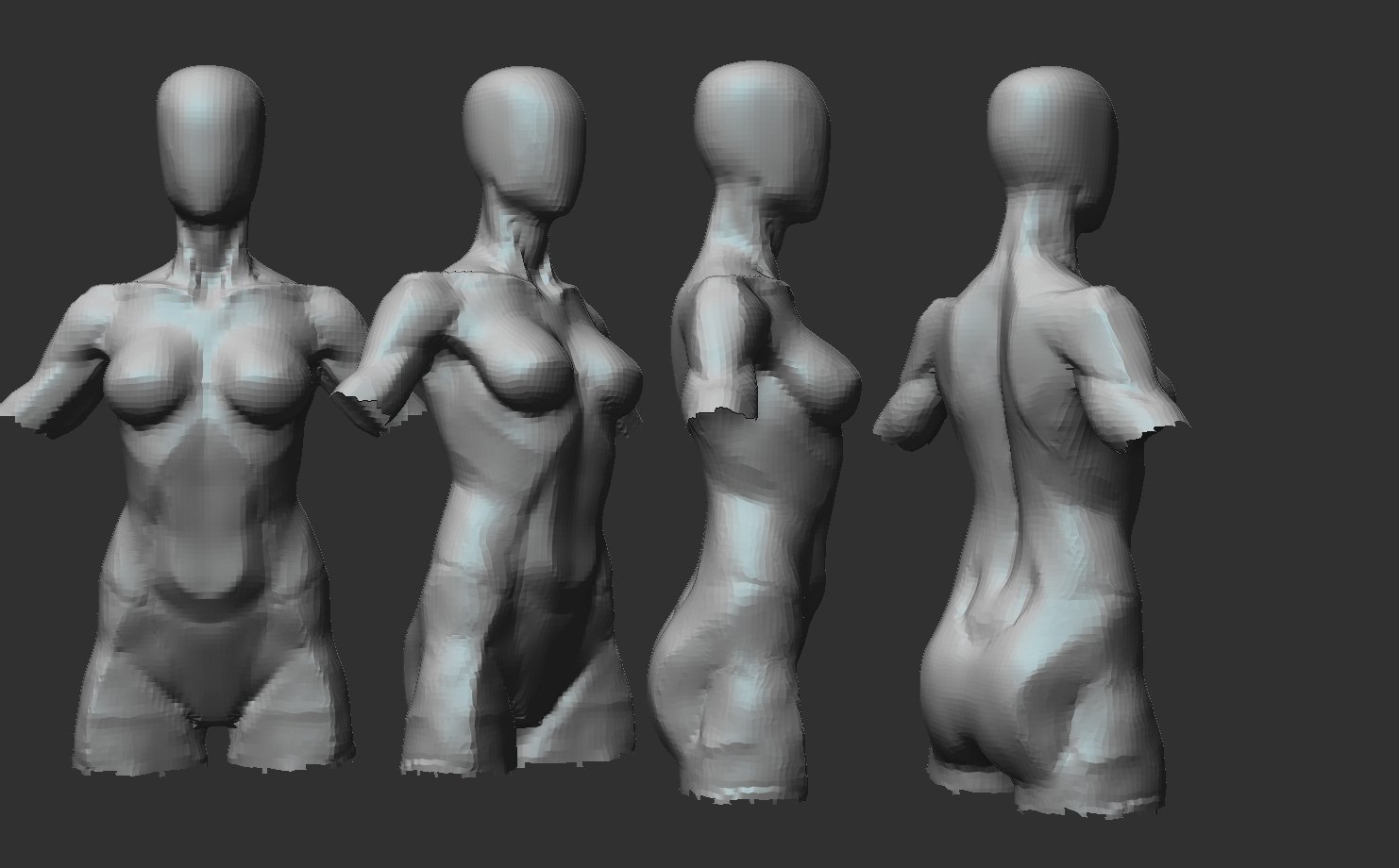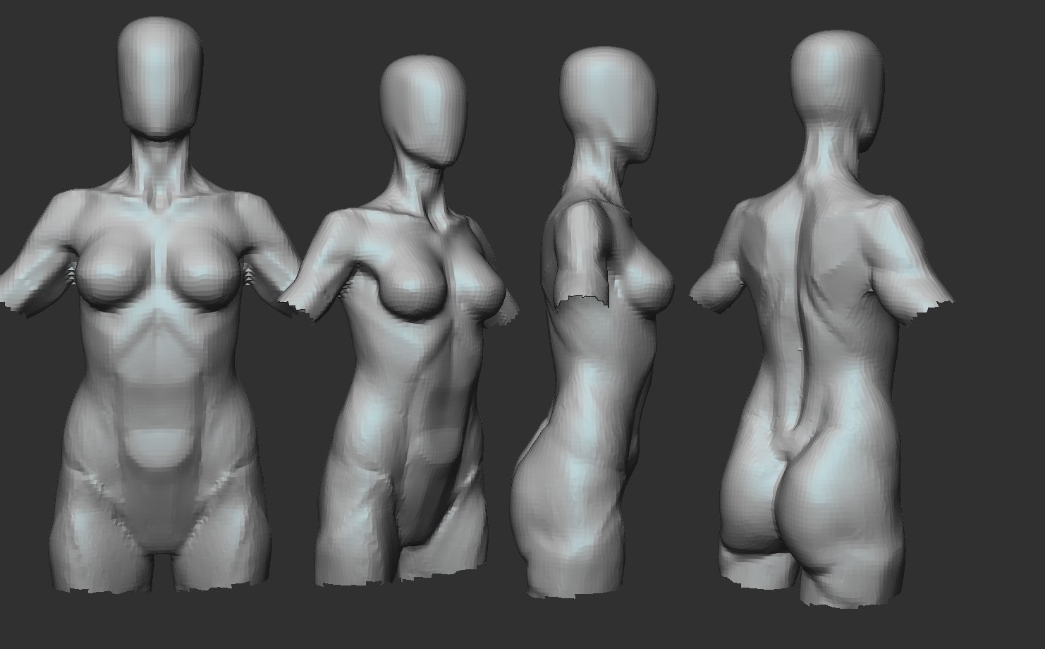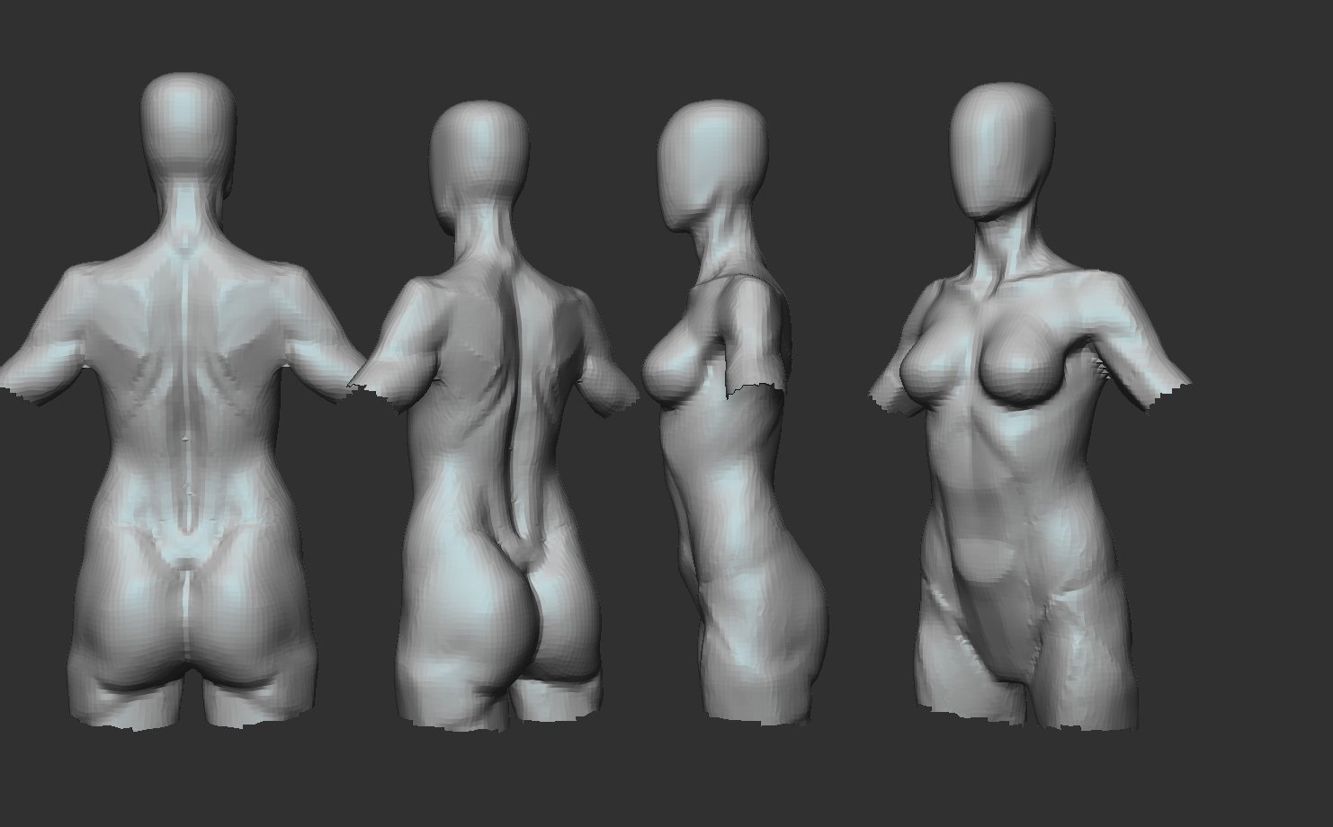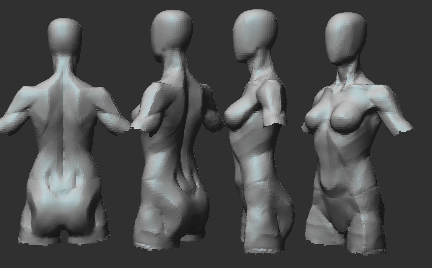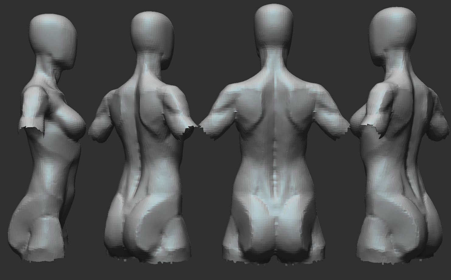 After a few bad days, I did some more sculpting today and made a bit of progress. I'm still not happy with it! It feels like it's getting somewhere, but it's not there yet, that torso. Especially the hips and upper back. I'll have to recheck what I'm doing there with the anatomy, because it definitely doesn't seem quite right, even for its limited resolution. I'm still struggling to get the back quite right in general, too. I hate how few references there are that show you an angle up the back to double check stuff like the depth of groove of the spine, or the exact shape the ribcage has at the back when viewed from below. There's scan data, of course, but I wish I had a lot of photos on hand, too. They'd be really convenient.