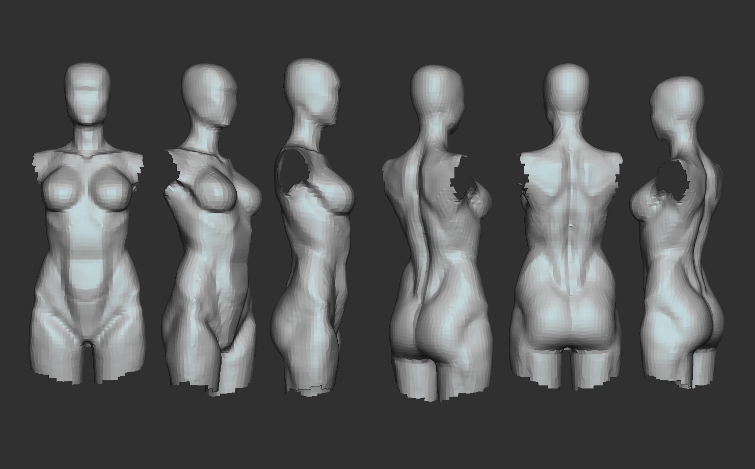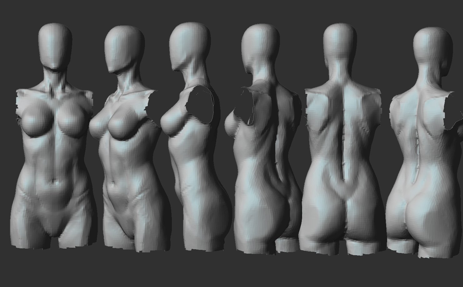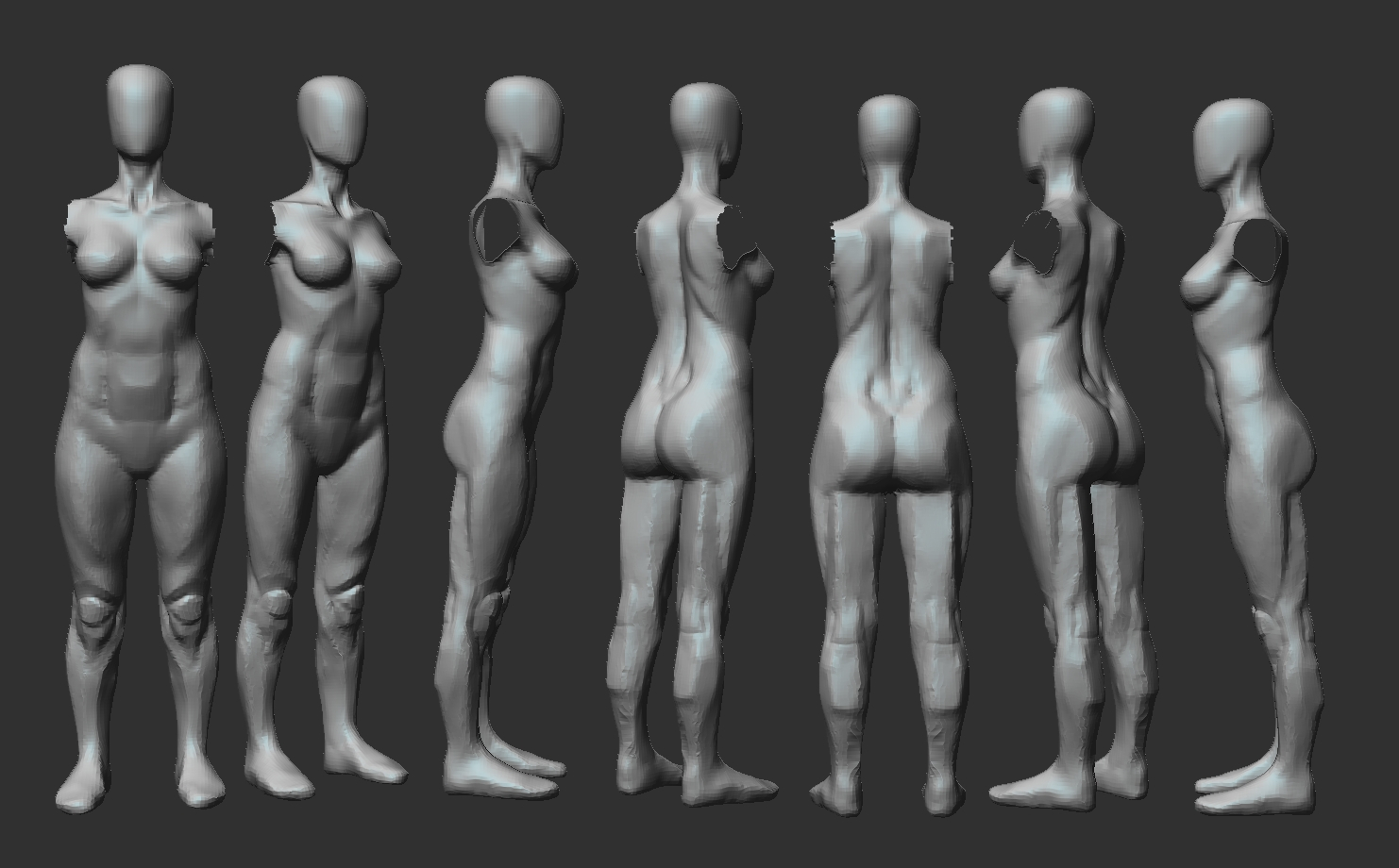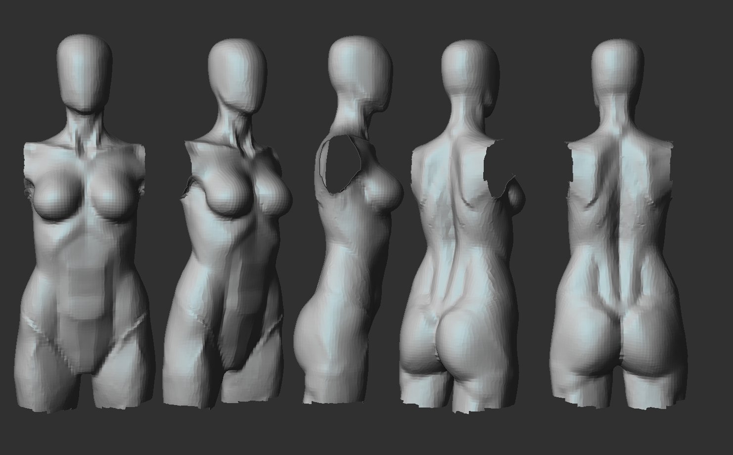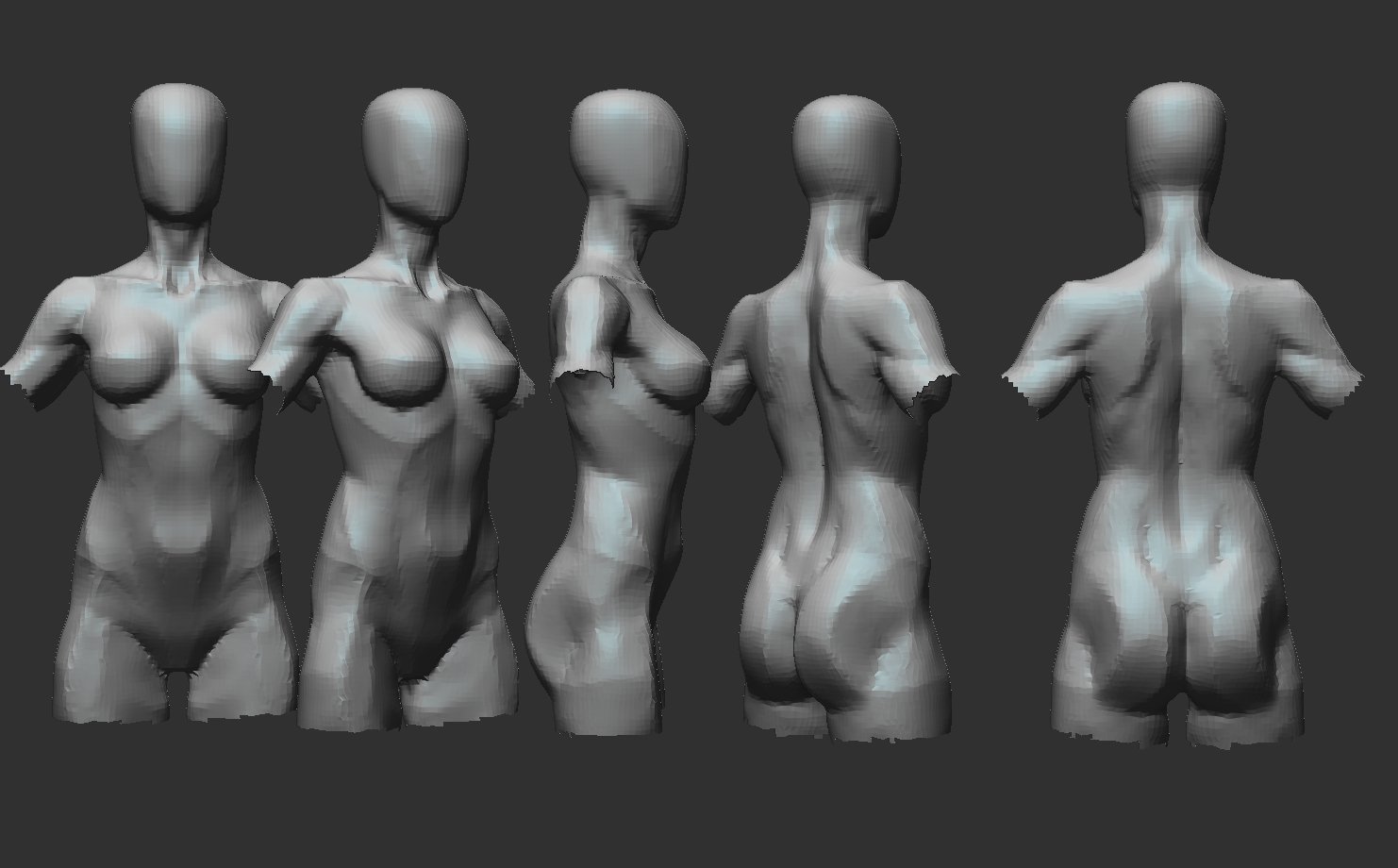 After a few bad days, I did some more sculpting today and made a bit of progress. I'm still not happy with it! It feels like it's getting somewhere, but it's not there yet, that torso. Especially the hips and upper back. I'll have to recheck what I'm doing there with the anatomy, because it definitely doesn't seem quite right, even for its limited resolution. I'm still struggling to get the back quite right in general, too. I hate how few references there are that show you an angle up the back to double check stuff like the depth of groove of the spine, or the exact shape the ribcage has at the back when viewed from below. There's scan data, of course, but I wish I had a lot of photos on hand, too. They'd be really convenient.