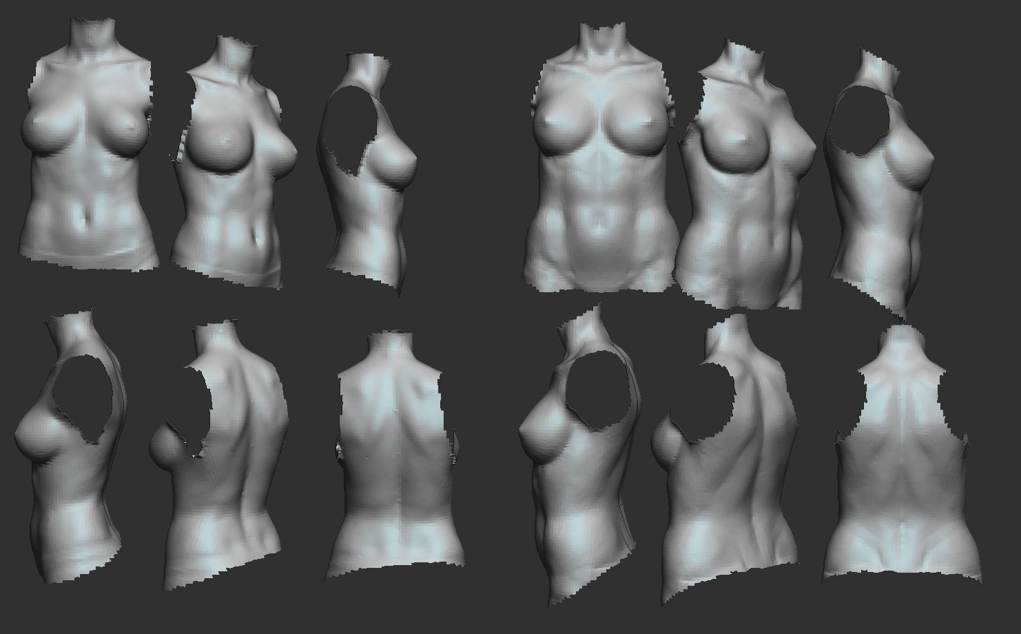Still working on it. I ended up revising the torso again because I'm still unsatisfied, and it's still no good. The left is the scan data dynameshed to the same level as my sculpt, and the right is mine. It's still not right.