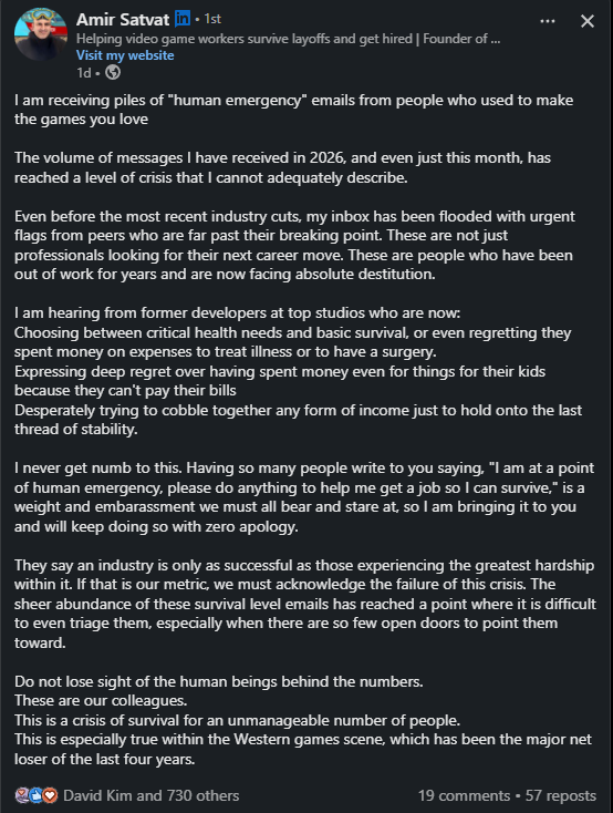 true, but their source is GDC's 2026 state of the games industry report, they aren't just making up numbers for the sake of a flashy headline. It also corroborates with everything I've seen/heard so far