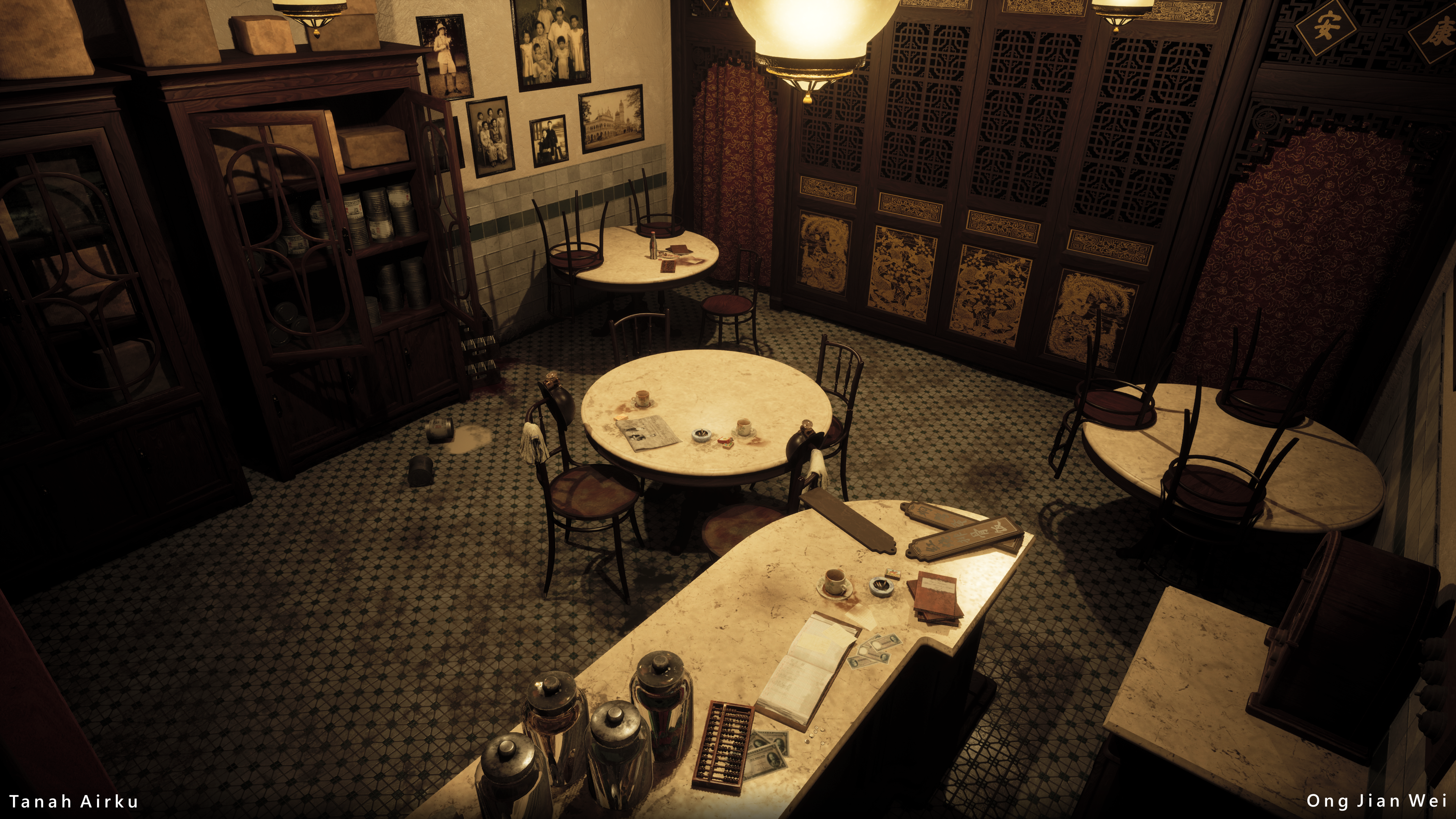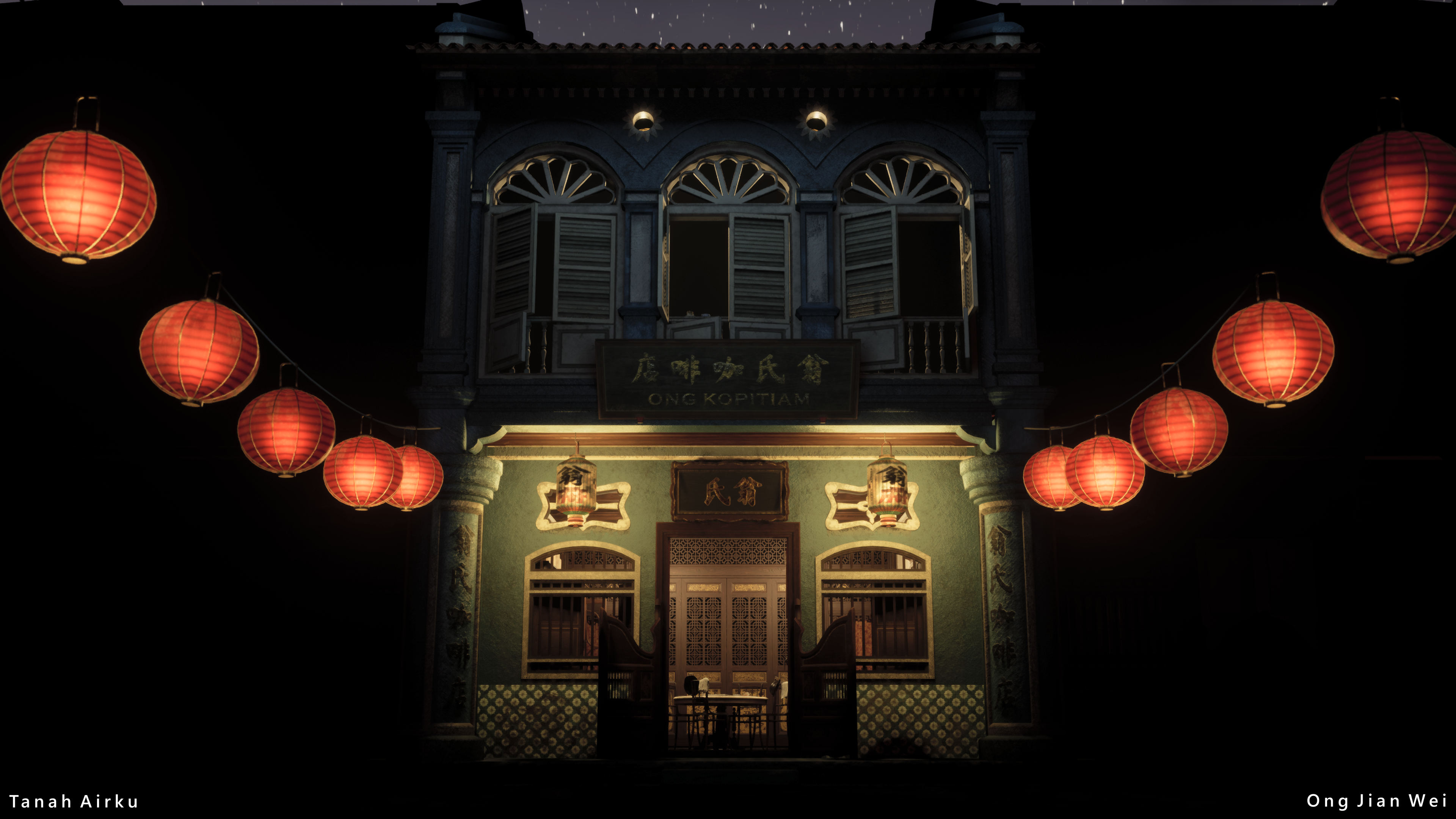 In this journey, we will also visit a newly built kopitiam (coffee shop) shophouse owned by a moderately wealthy family of Chinese immigrants, featuring subtle hints of Peranakan Chinese influence in its design and culture.