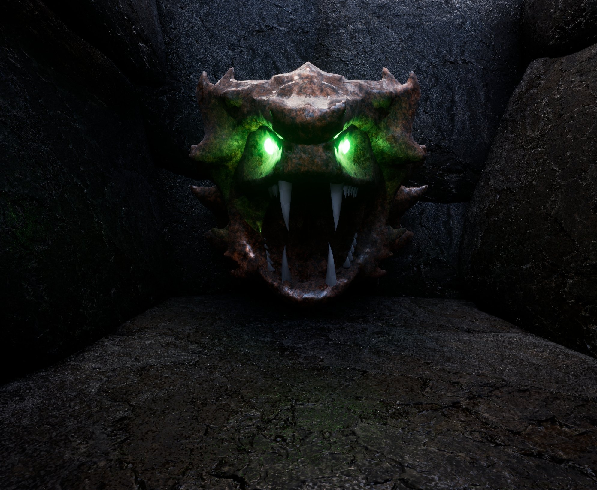 As far as lighting I think your scene would greatly benefit from a fog to help it actually feel like a humid scary cave, and to help diffuse your lighting. The snake eyes are super intense lol i would turn down the intensity and leave them as wip until you have a more finalized version of the materials. Having a super bright neon green light right in the center of the image completely messes with the composition, and makes it hard for the viewers eyes to focus on anything else.
