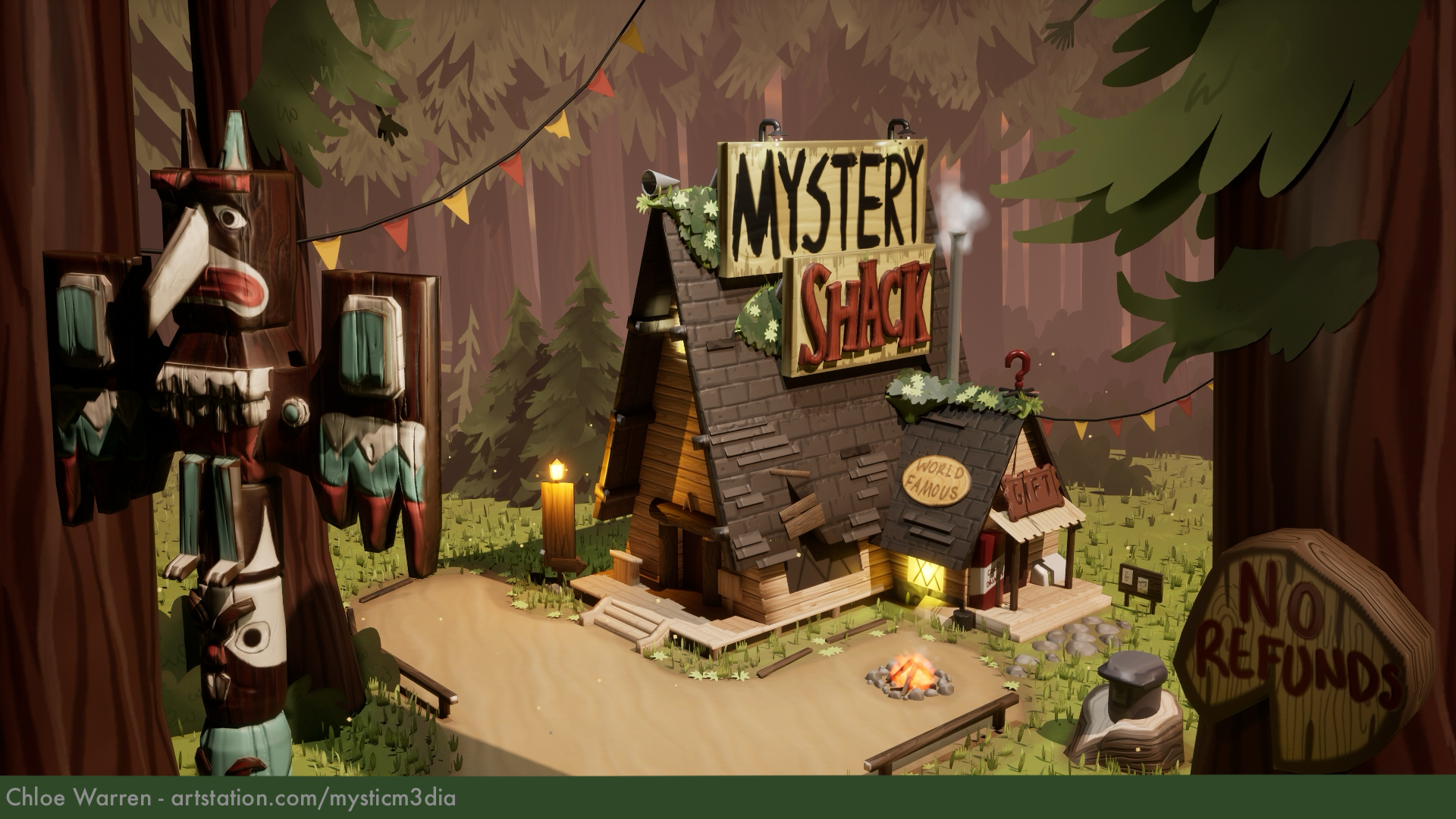 This is a 3d environment based off of the 2d Mystery Shack from Gravity Falls. I created it using Maya, Zbrush, Substance Painter, and Unreal Engine. I had so much fun with this project and I'm excited to show it off!
