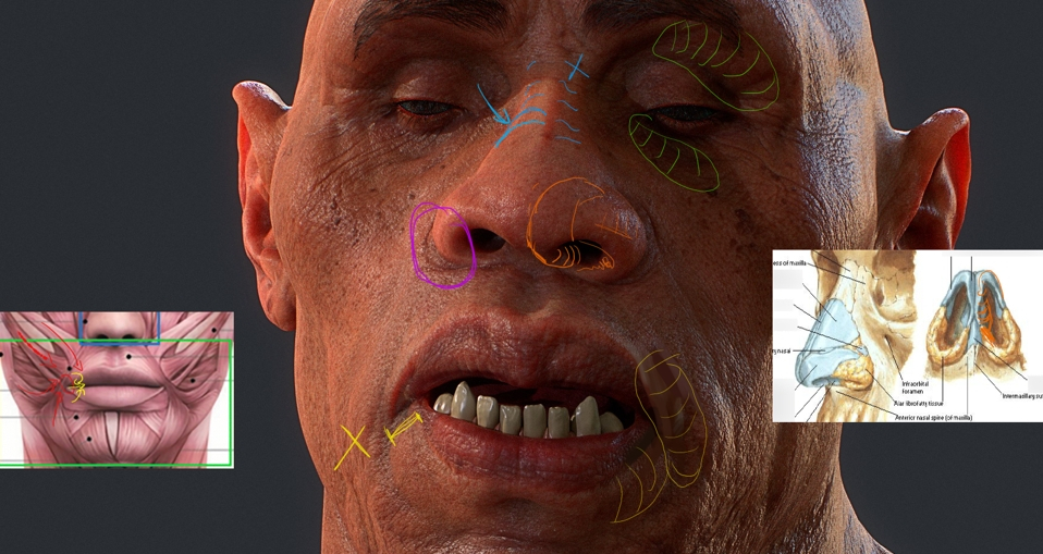 ▣ Noses suffer a lot in 3D, they tend to get too smoothed over. The transition from bone to cartilage can be very subtle, but it's noticeable as a change in geometry and color. I feel the ridges at the top of the nose bridge should be more to the sides, in line with with the division of the nasal bones x maxilla, and this ridge won't continue once you get to the cartilage. Sometimes the nasalis muscles stand out from the cheeks and the nose, but they aren't a continuation of the bone division.