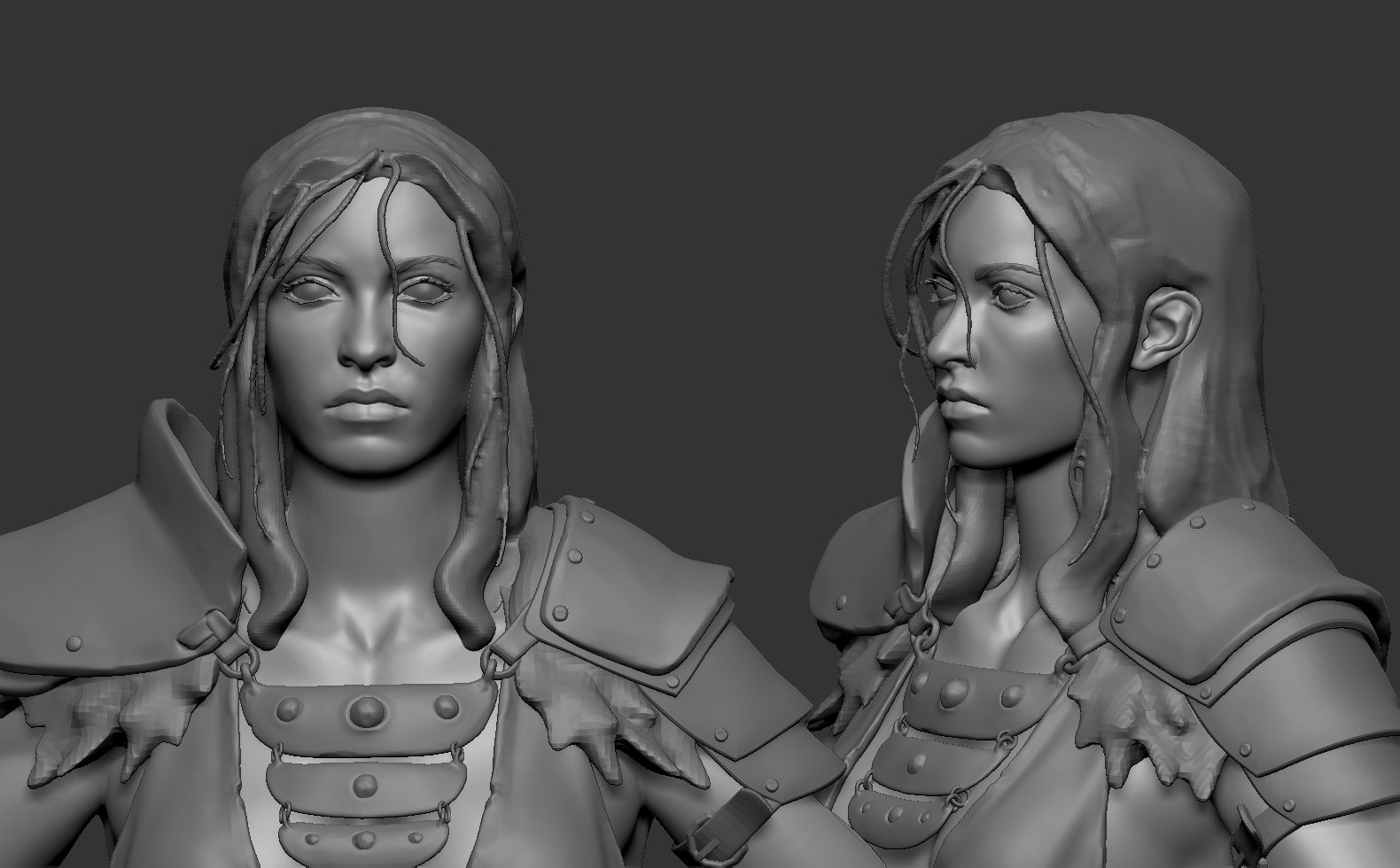 I wanted to see if I could do a little refresh of her design and challenge myself by working on a character with a lot of little moving pieces. Style-wise I'm trying to hit a cross between what I personally find appealing, and the class bodies from Diablo IV.