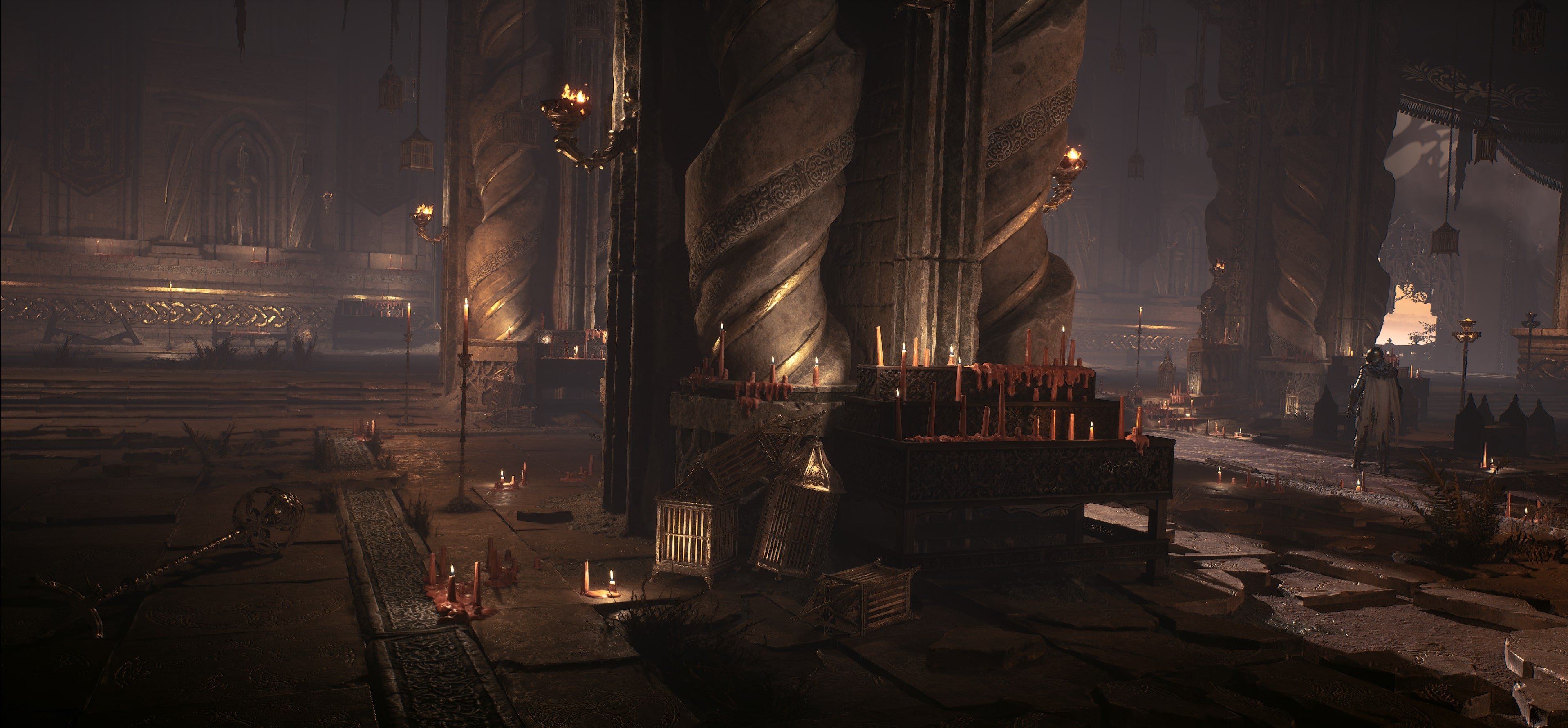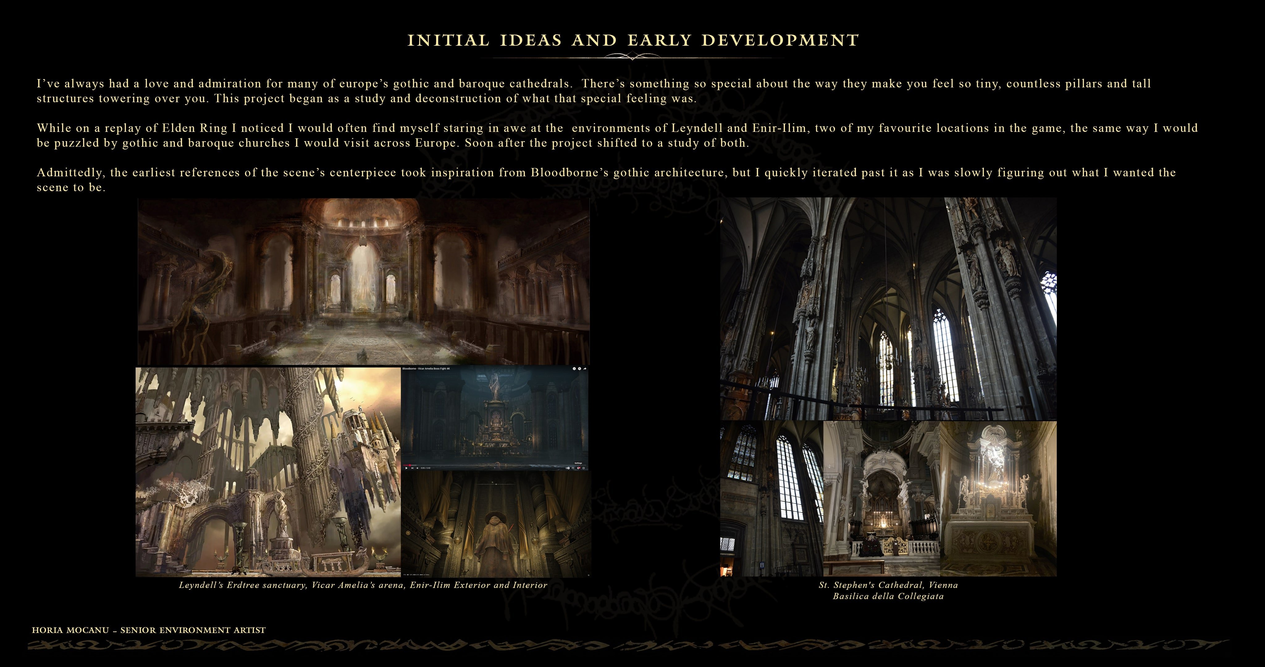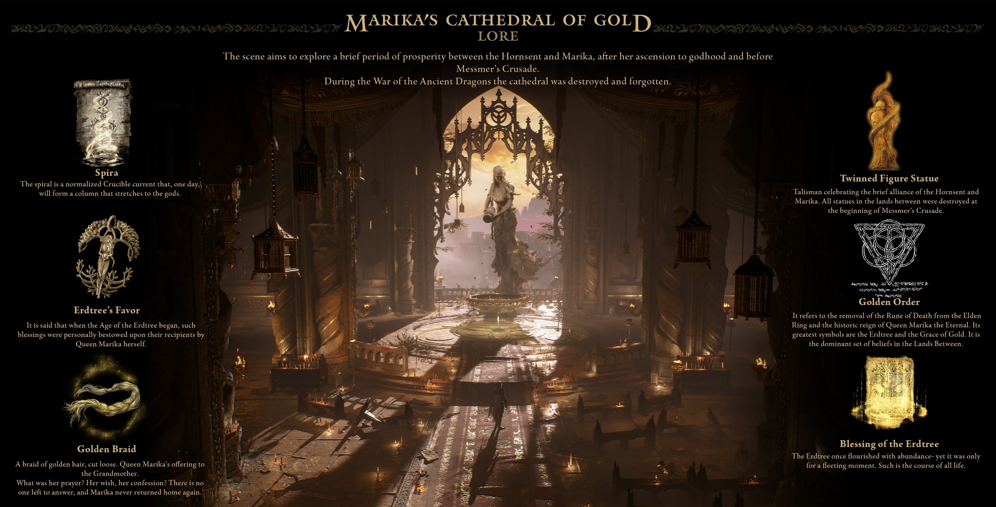 After her ascension to godhood and before Messmer’s Crusade there was a brief period of peace between Queen Marika and the Hornsent. Built as a celebration of the two cultures, the cathedral thus shares Leyndell’s golden lineage and Enir Ilim’s heavenly spirals.
