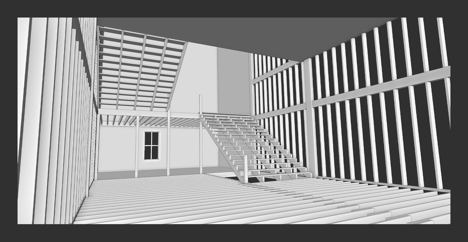 All of this material adds a certain amount of visual weight. Especially when clad with the final layers of lath, plaster, and trim. Even the broken staircase in the concept has a particular weightiness to it. Whereas a lot of the shapes in the block out feel a bit newer and less substantial.