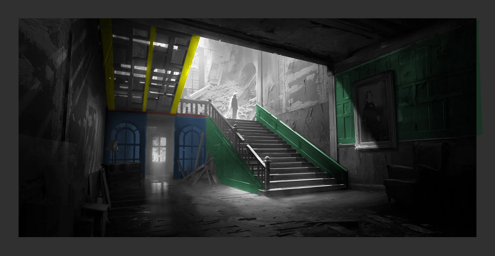 Overall the right side of the frame feels more developed than the left side. Both in the block out and the concept. The area around the opening that connects the main foyer to the adjacent room feels visually underdeveloped and cluttered at the same time.