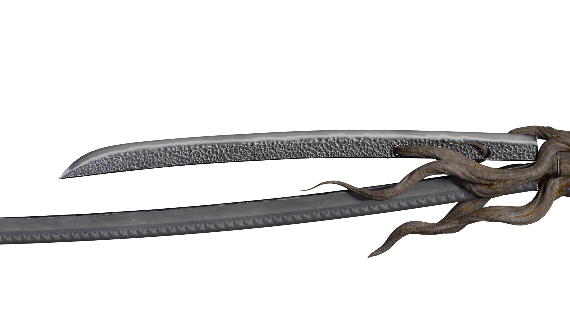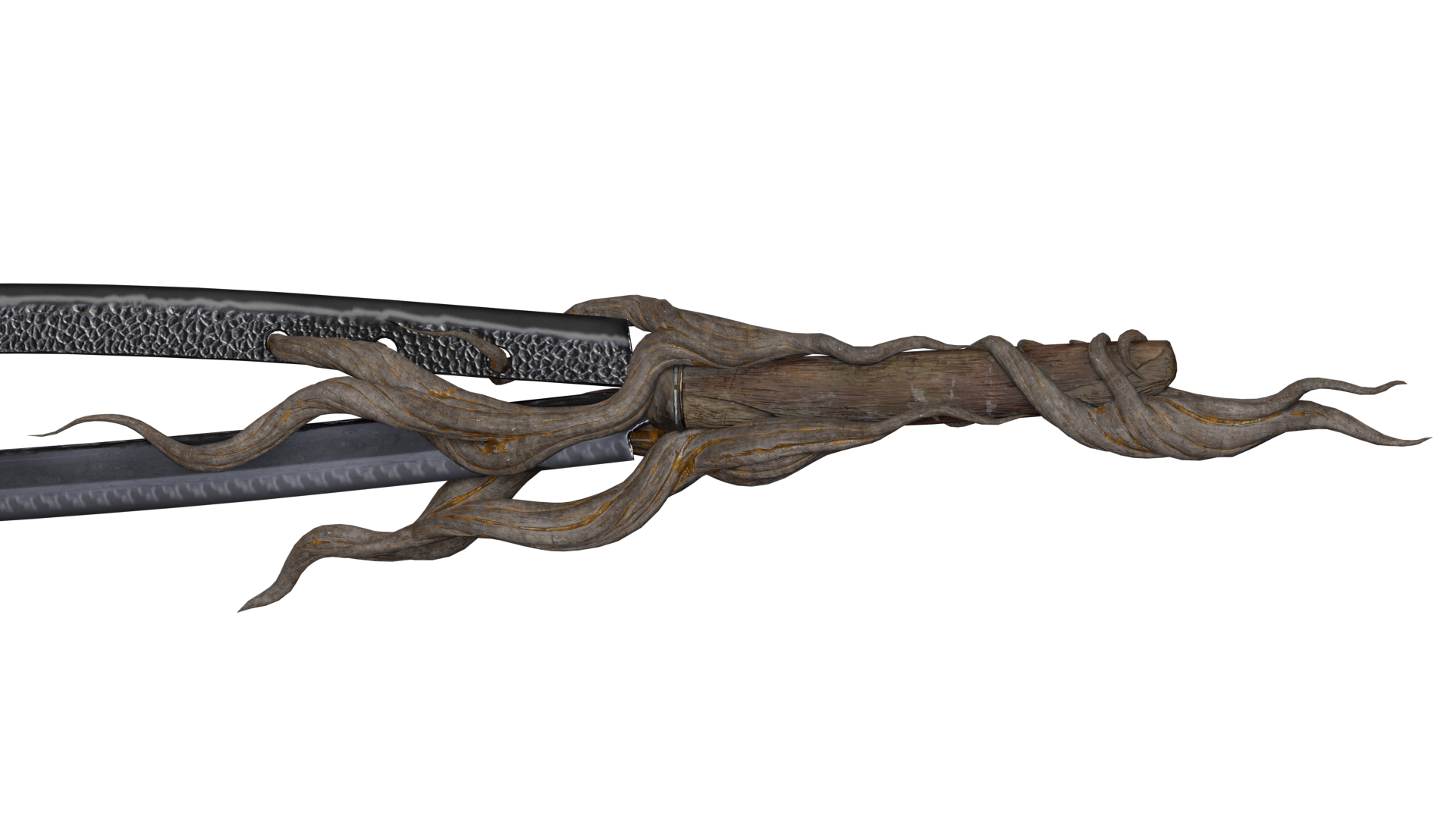 As far as the branches and roots themselves: the biggest challenge is incorporating them into the objects in a way that makes sense from both a visual and mechanical design perspective. The holes in the katana blade open the question of who put them there and why? Is there a better way to connect the blade to the hilt? Would the branches and roots of a tree grow through or around something like a shield?