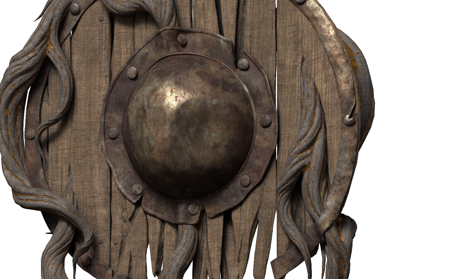 The branches on the sword really don’t look like the ones on the shield, i definitely need to go back and redo a lot of stuff. i’ve already made some changes, ditched parts that I felt that didn’t suit it well, like the “crown” at the connection between the blade and the handle. as for the wooden boards, I left them to do the tertiary details once I finish the branches. I got Pablo Muñoz’s wooden brush pack a while ago, so i’ll be doing a lot of tests to see what fits better.