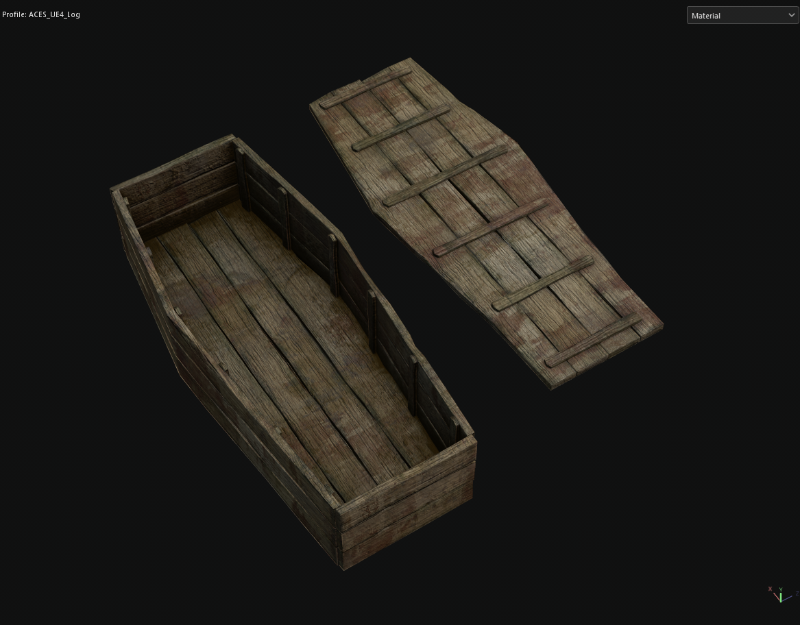 I also started adding some supporting assets to help populate the scene. So far I’ve completed a wooden coffin/casket and a simple wooden bench. Both of these are also using RGB mask overlays in UE5 to add extra grime, wear, and subtle variation so they don’t feel too clean or repetitive.
