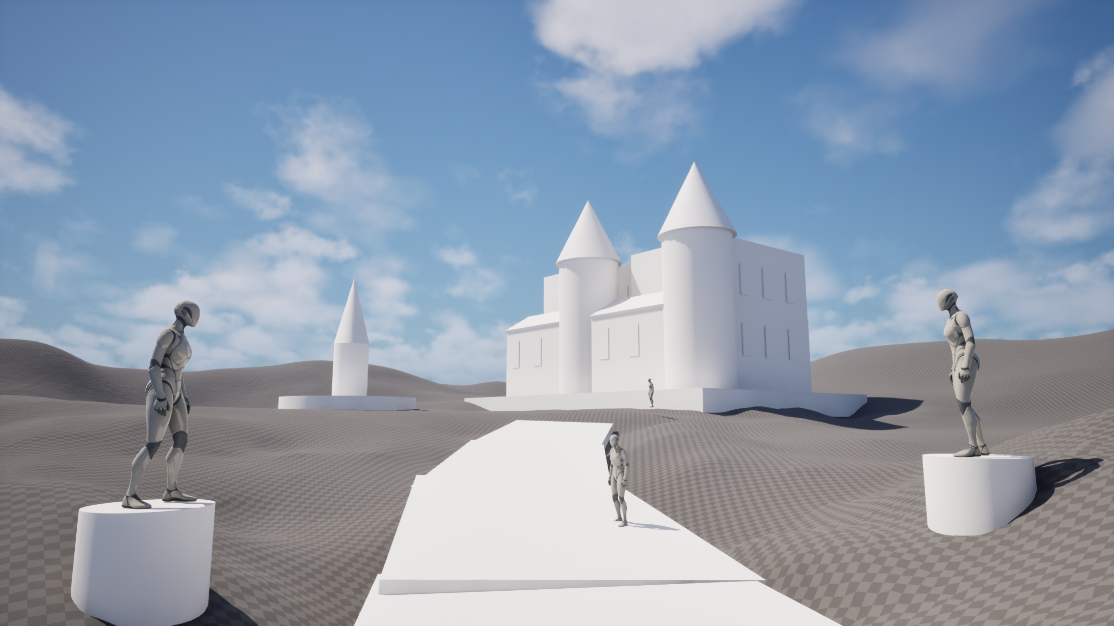 I have added a few more elements to my composition blockout in UE5.7 to push the layout and overall feel a bit further.