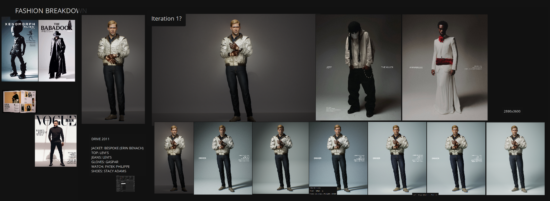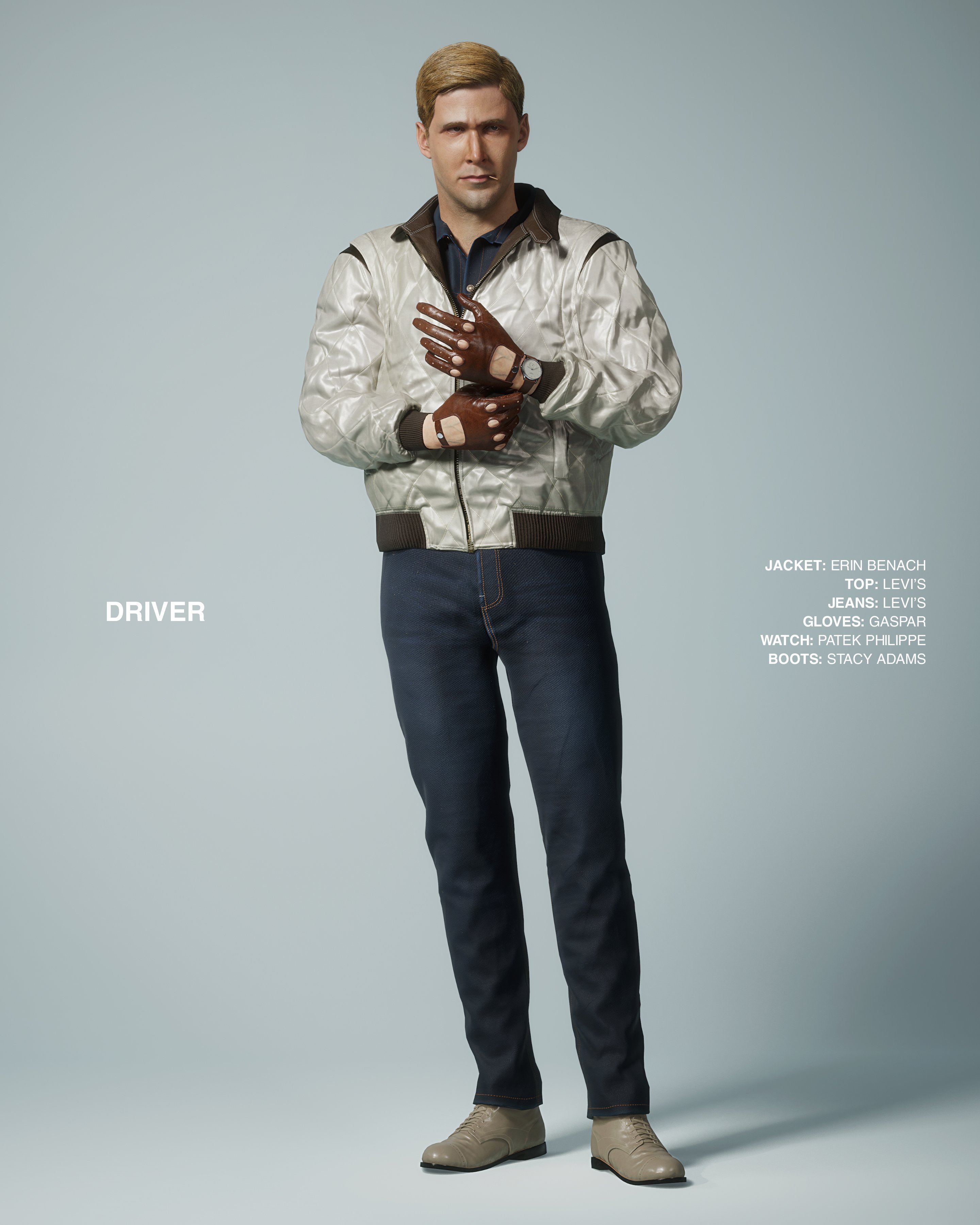 Next was a character fashion editorial spread-type shot. I'd been watching Wisdom Kaye reels, and noticed that Ryan actually has some branded drip going on in the movie. Jeans, Gaspar gloves, a Patek watch, Stacy Adams shoes, and so on. Feeling inspired by Wisdom, I wanted to make a fashion spread for him, just for fun.