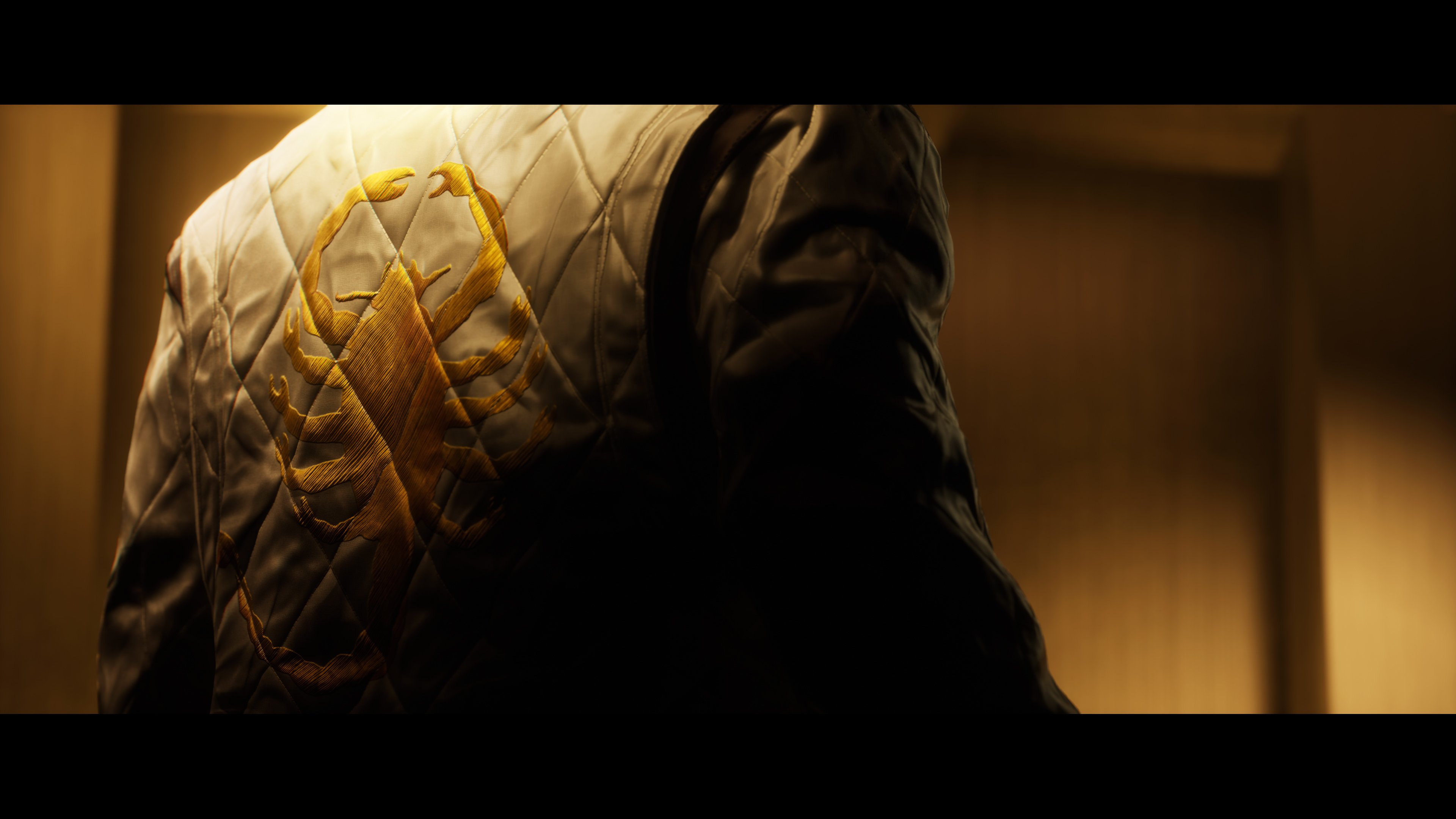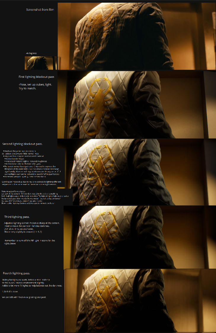 First is the iconic elevator shot. No spoilers, but it's one that stuck with me ever since I first saw it, and it's a shot that showcases the back of the jacket very well. This particular shot made me realize that my initial jacket texture (in the 2nd shot) was severely lacking; I had made some choices such as 'not having the jacket stitching overlap the scorpion', etc. I went back and amped up the detail, and I think it turned out a lot better for it. Very glad to have noticed it.
