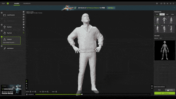 Initially, I created a rig with Advanced Skeleton, but I don't have much experience with weight painting, so I ran into trouble with the armpit areas of the jacket and so on, as is the case for any humanoid rig. A little hesitant to spend time on it, I looked for auto rigging solutions, and came across AccuRig, which thankfully had a free version. In a matter of minutes I had a rig of surprising quality! It solved all my weight painting problems.