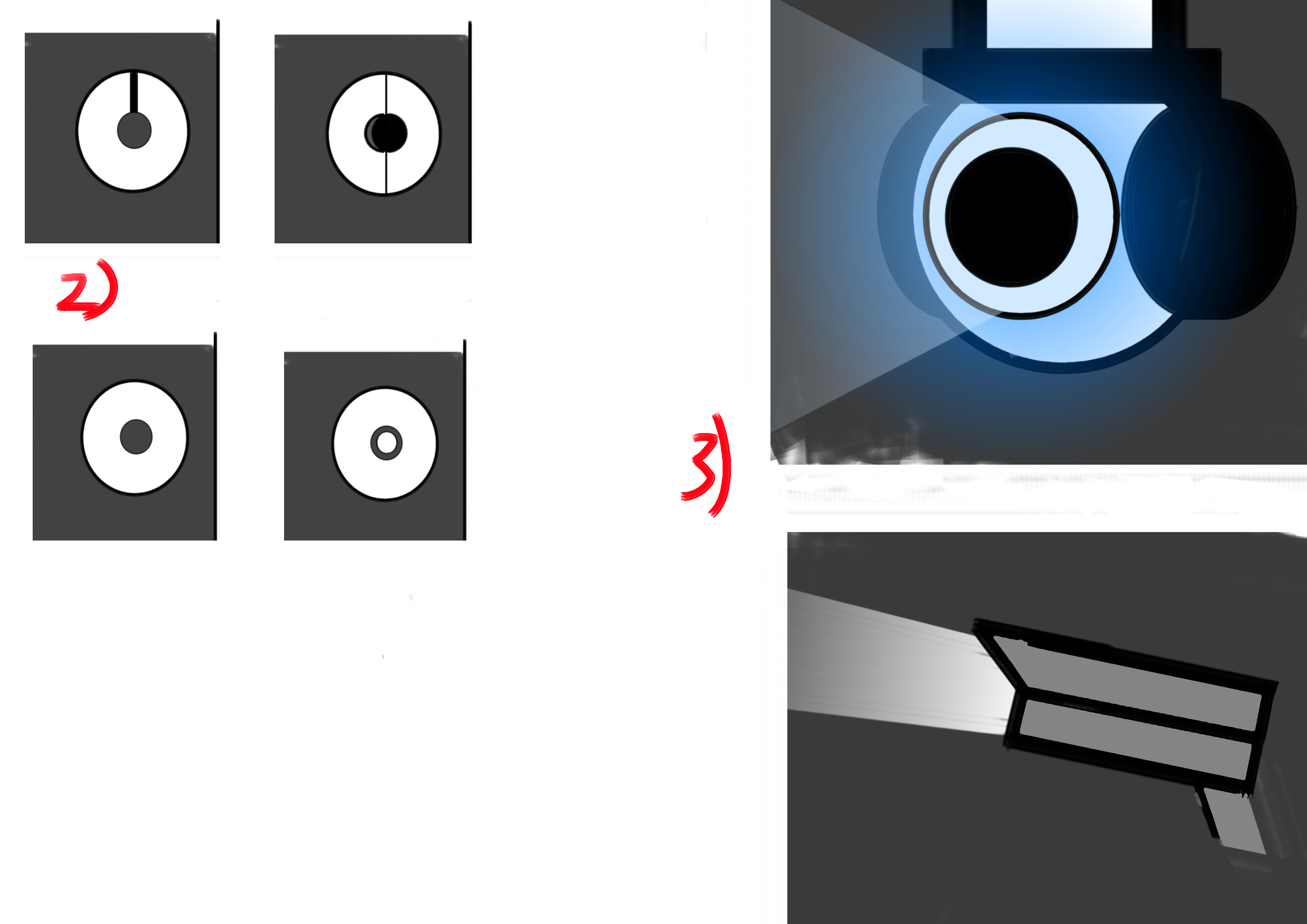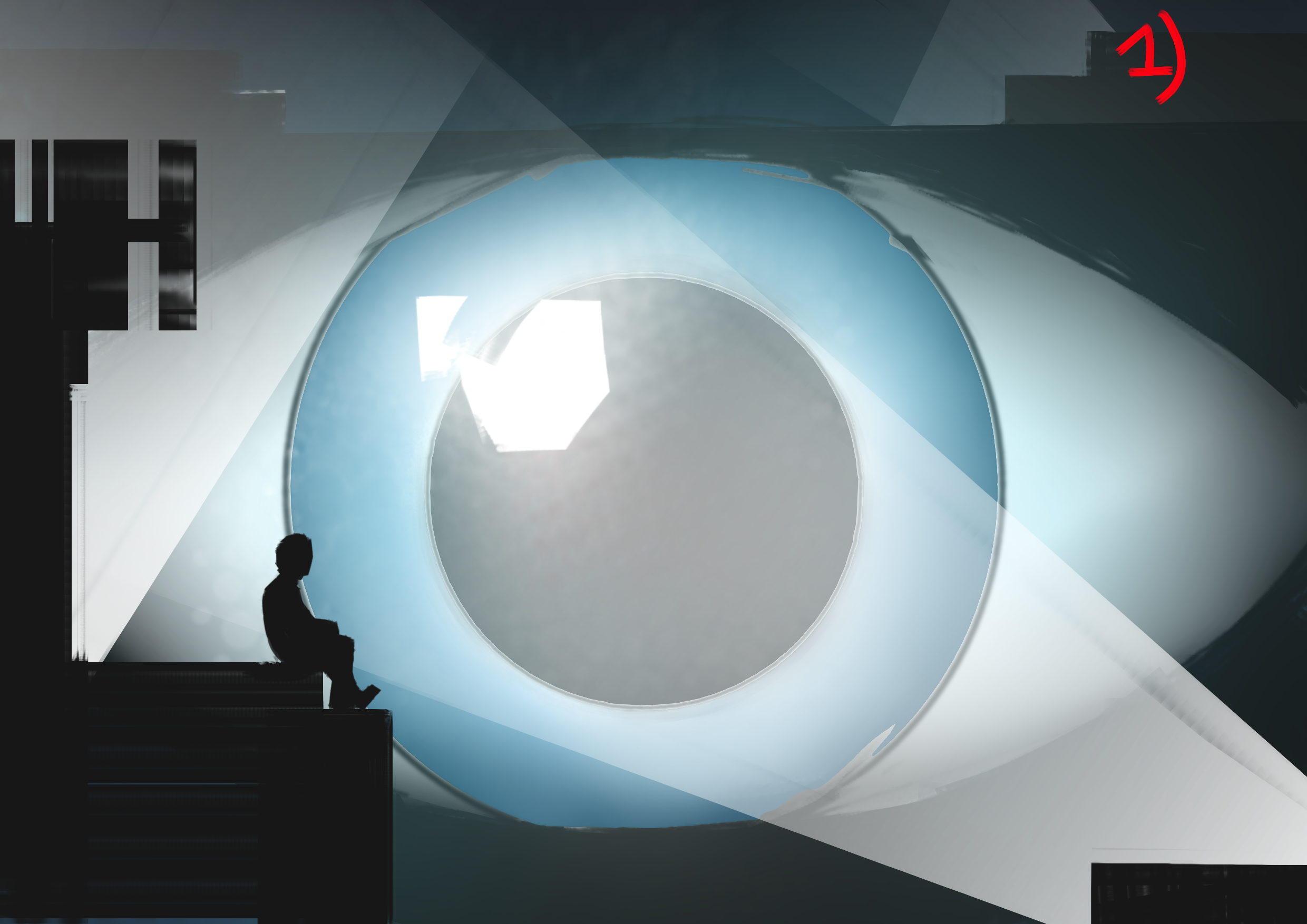 I'm looking for feedback on my second set of environment sketches after some initial feedback. In particular, I'm trying to find which design ideas communicate the theme of surveillance most strongly, as well as the related theme of constructed appearances (celebrity / idol culture, advertisement). Each sketch combines multiple ideas together so feel free to point out specific details that work / don't work.