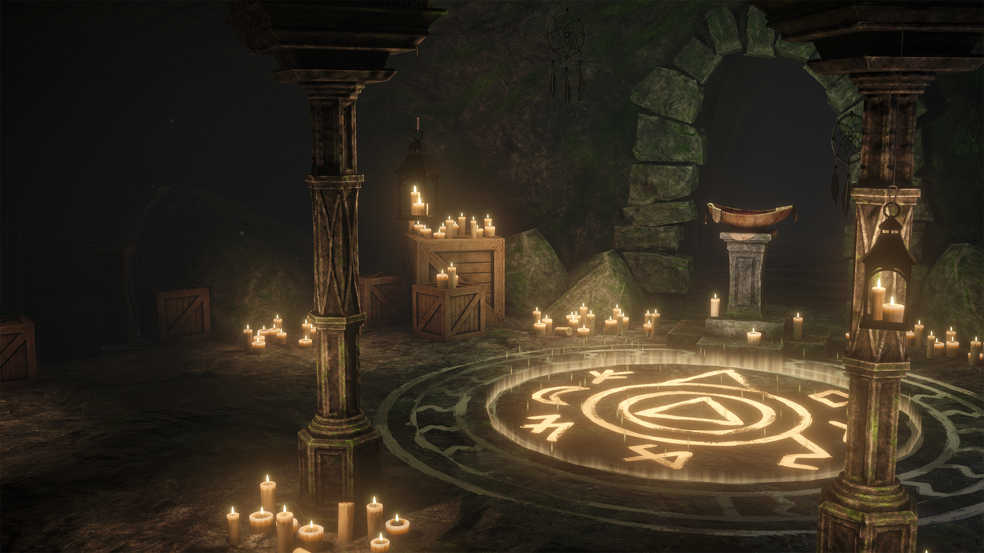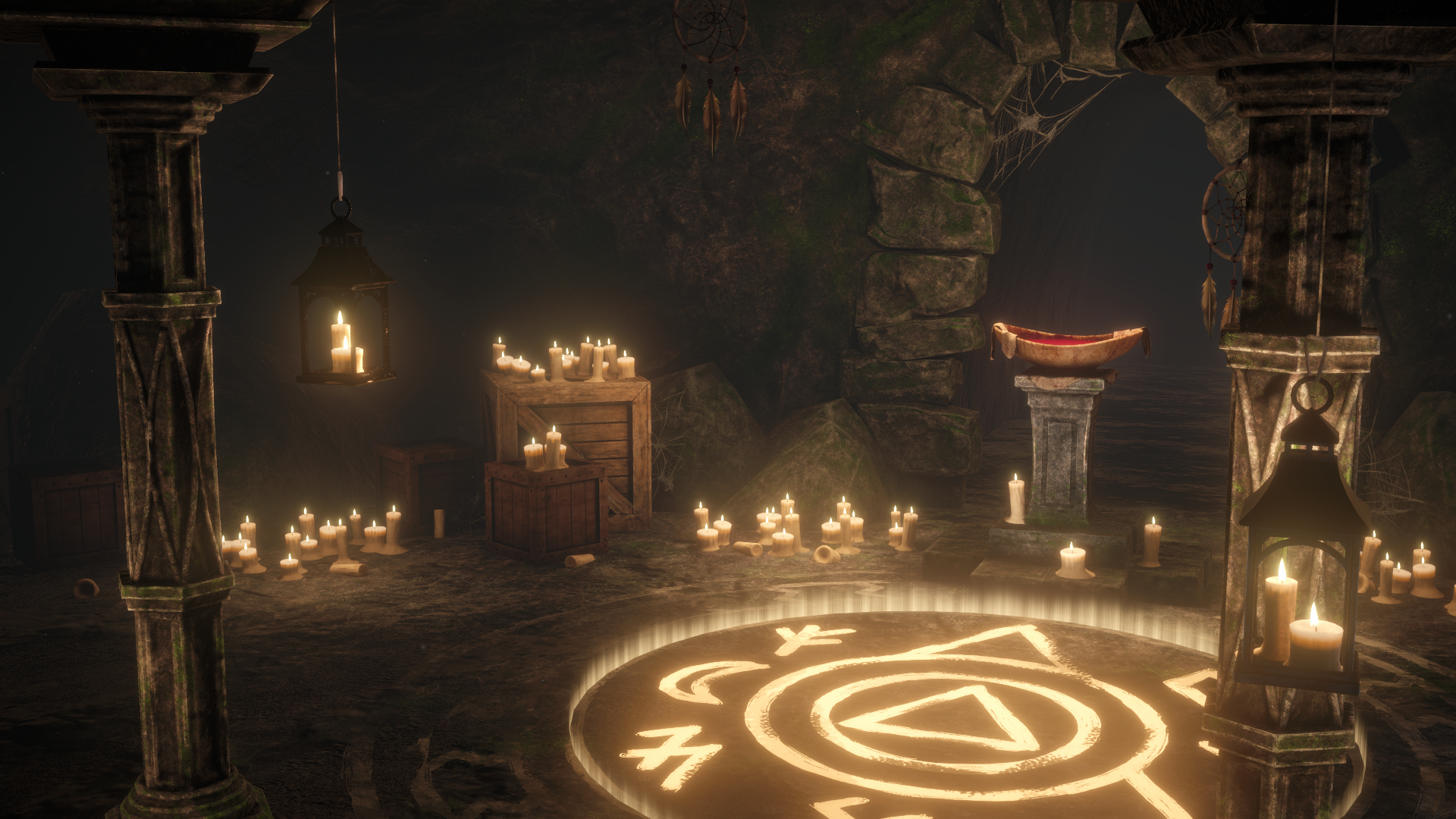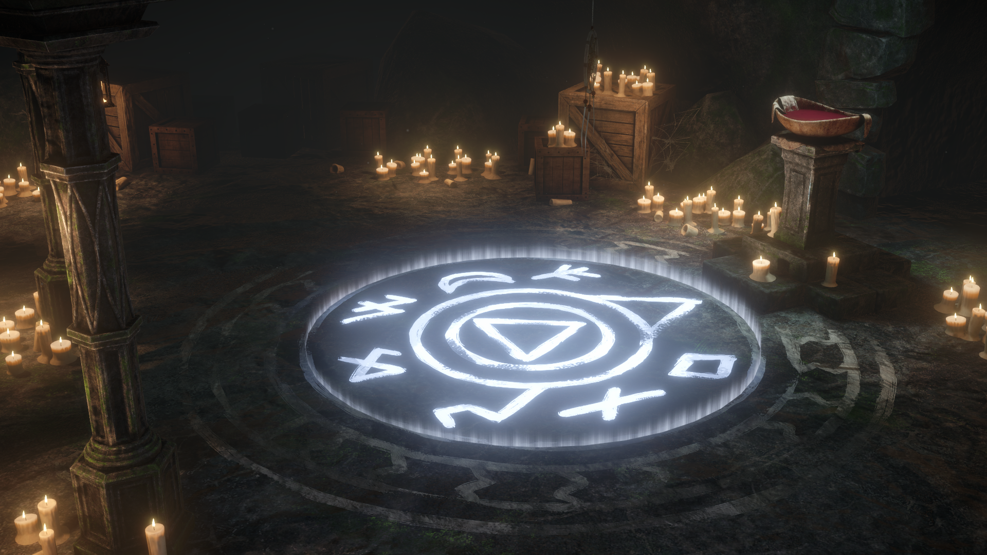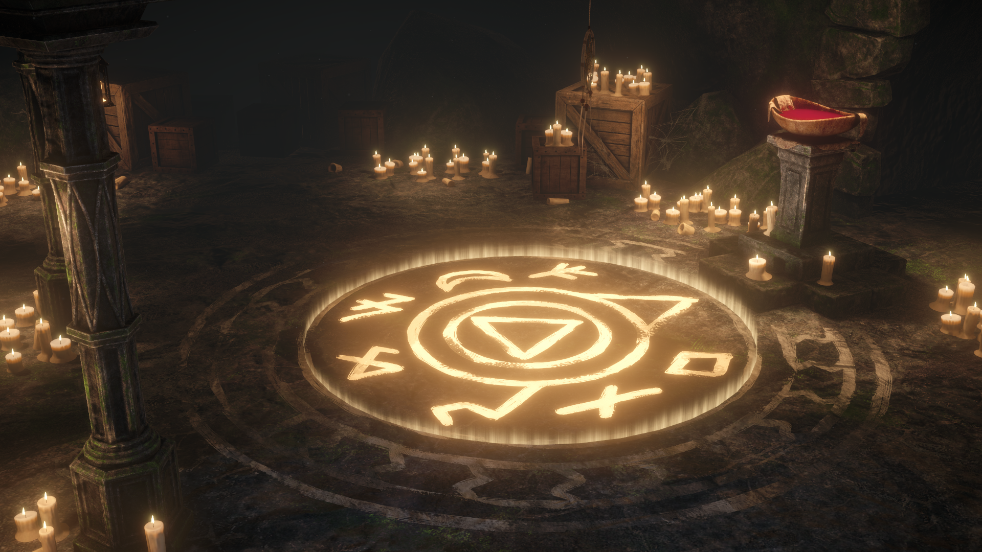 • Emissive ritual circle, candle-lit interior