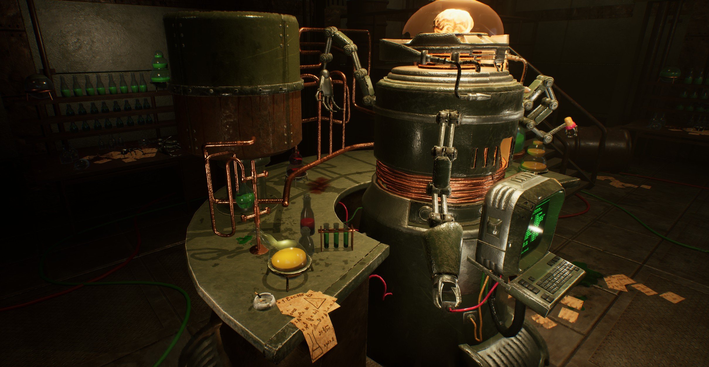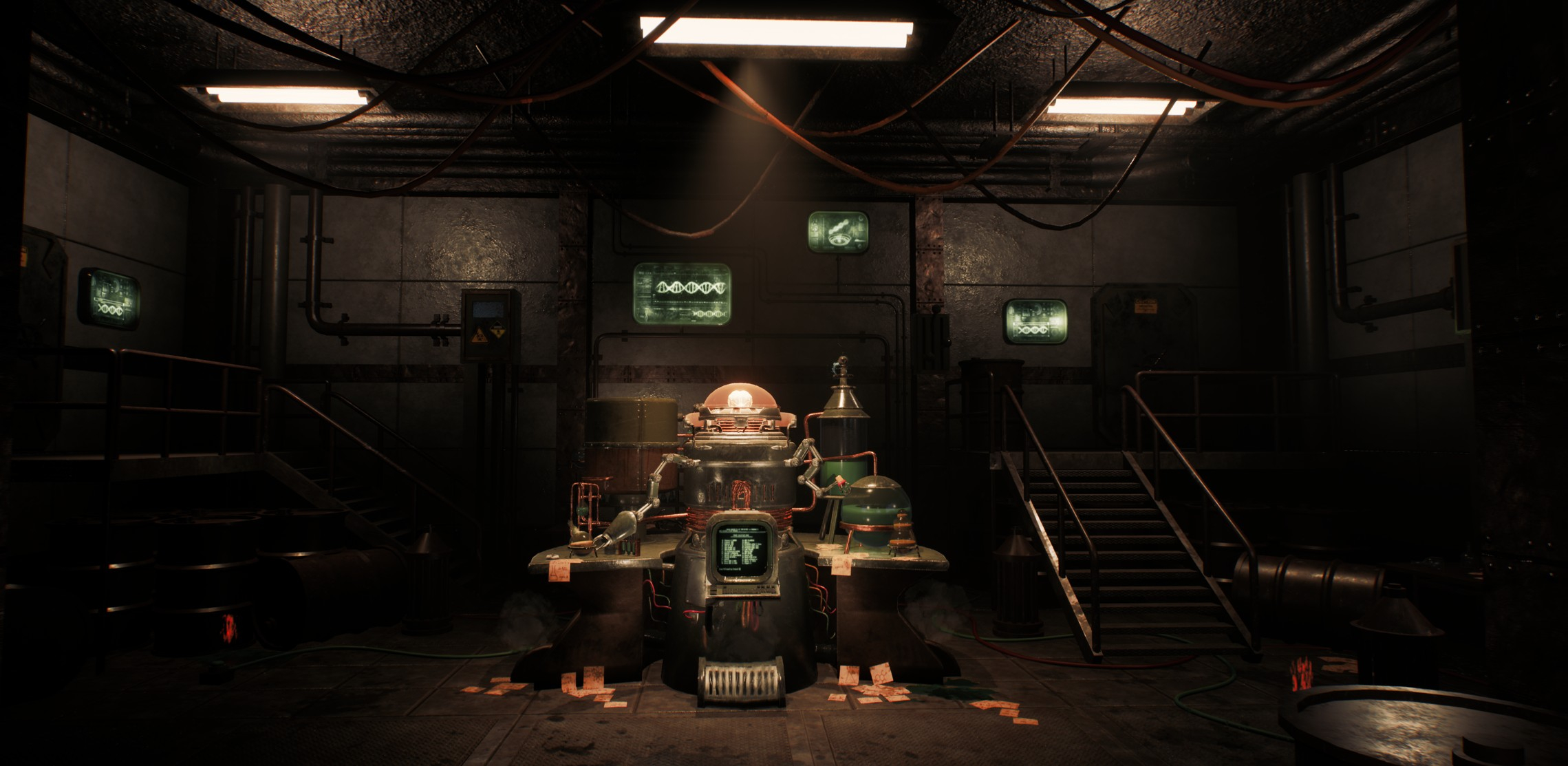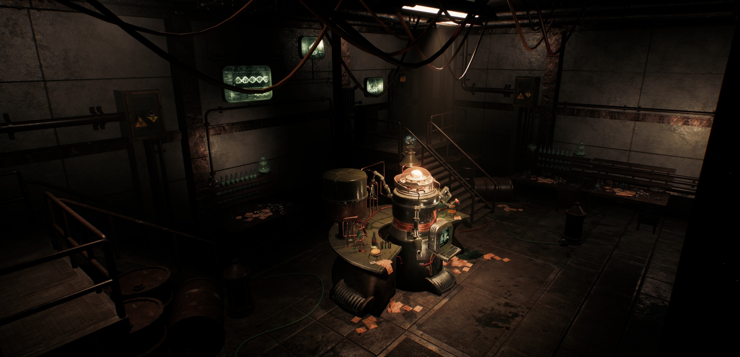 -Added DNA textures to the wall screens to help tie the environment together and emphasize the lab’s experimental focus.