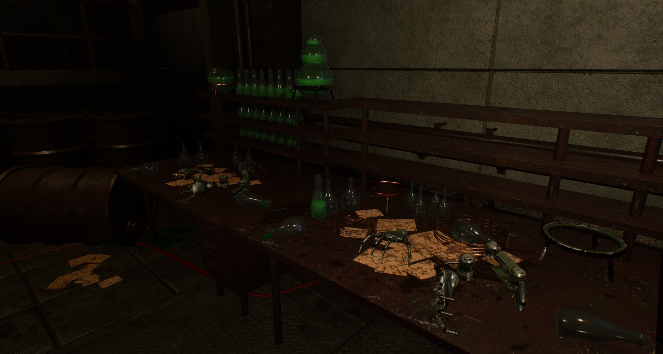 The main hero asset for this project is the Harm-a-ceutical Chemistry Bench, which I plan to place in a secret science lab–style environment.