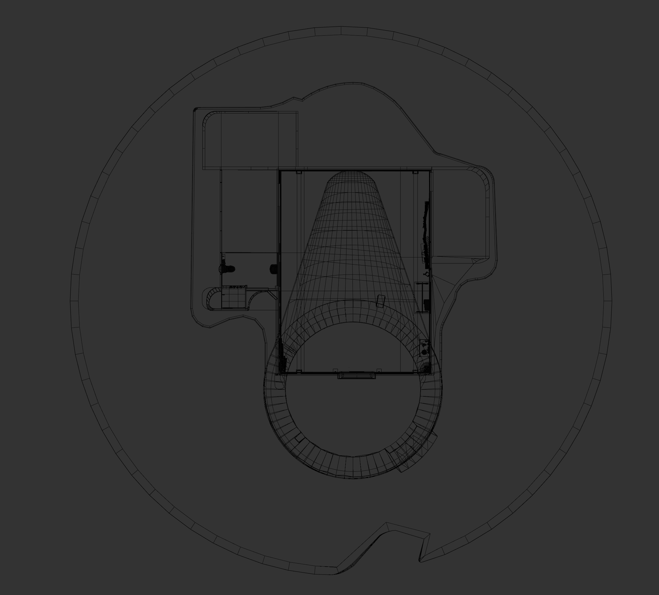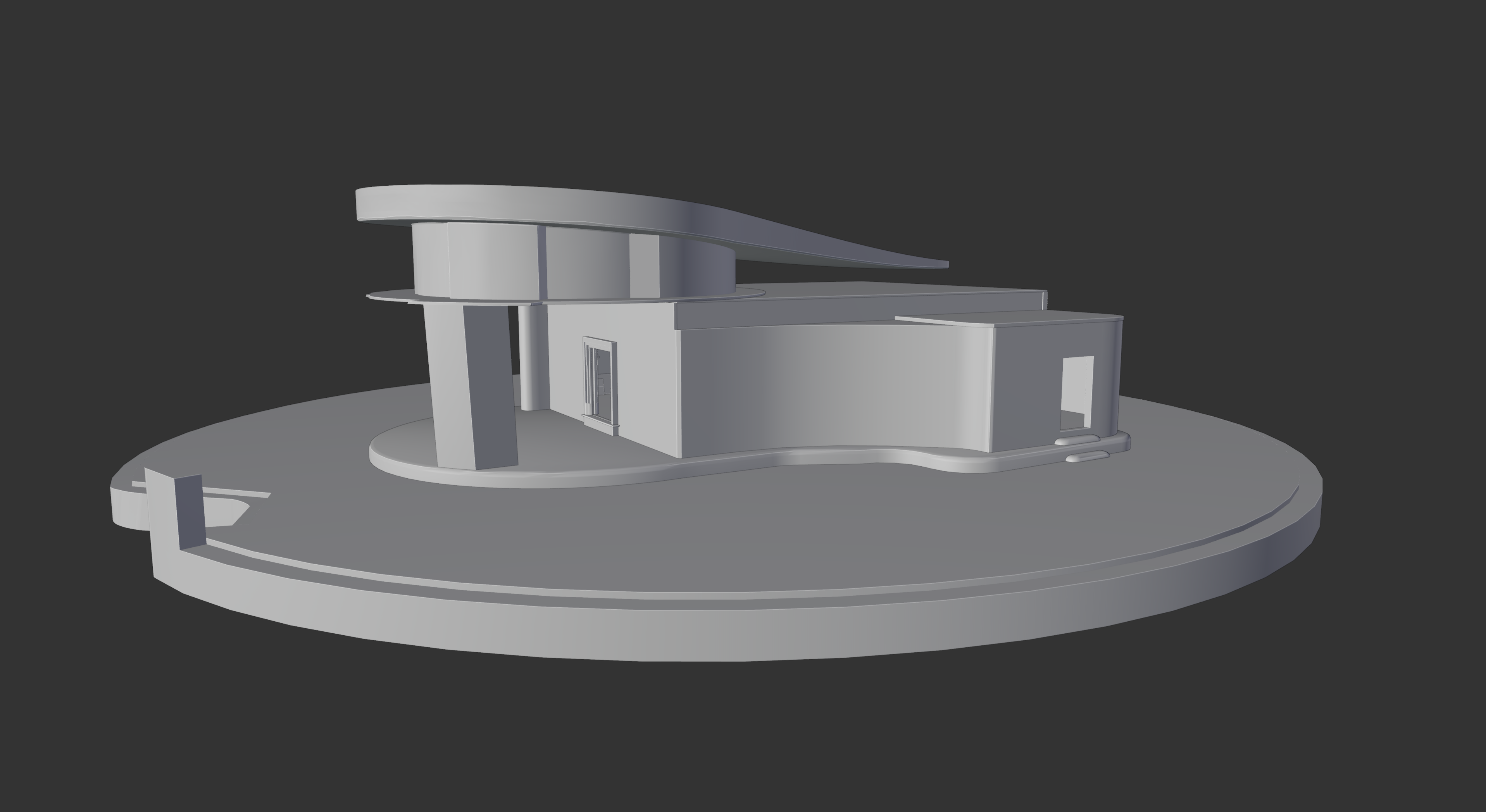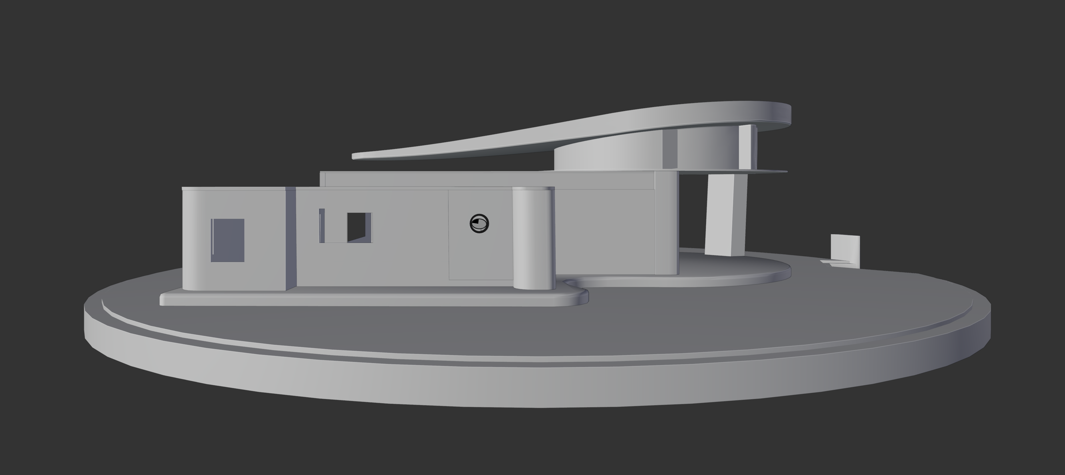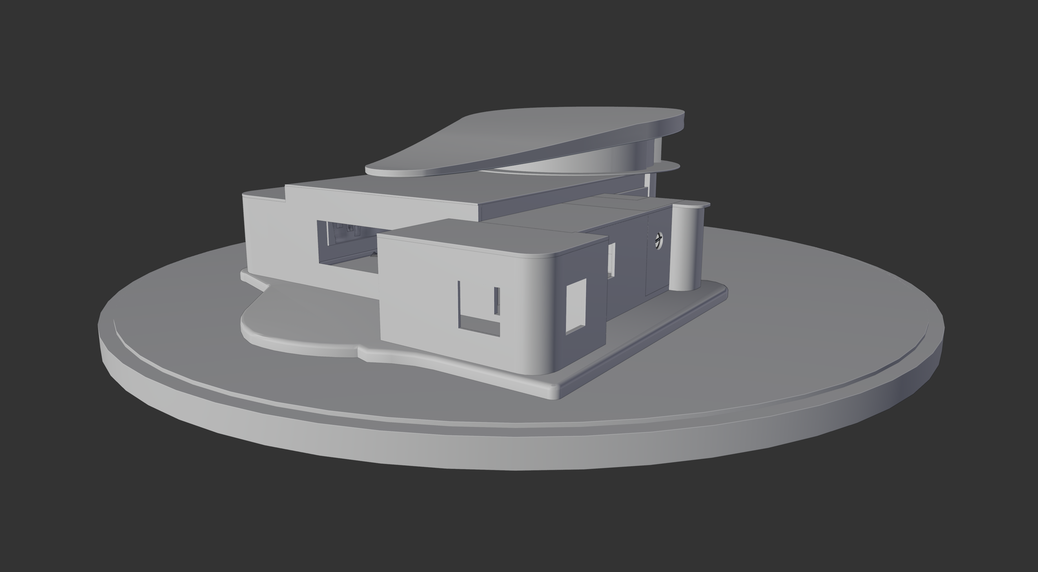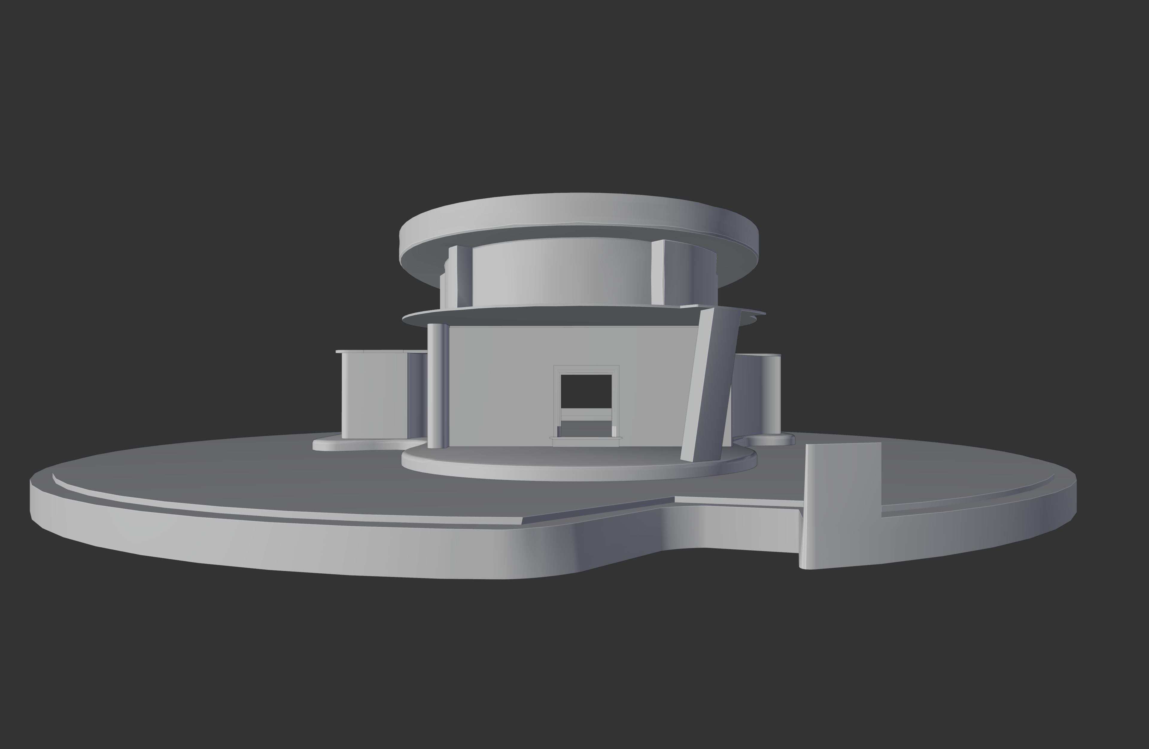 A detailed study of the exterior of The Obol, the home/studio of the artist Dafome. This set of renders shows multiple angles, including top-down views and structural X-ray perspectives.