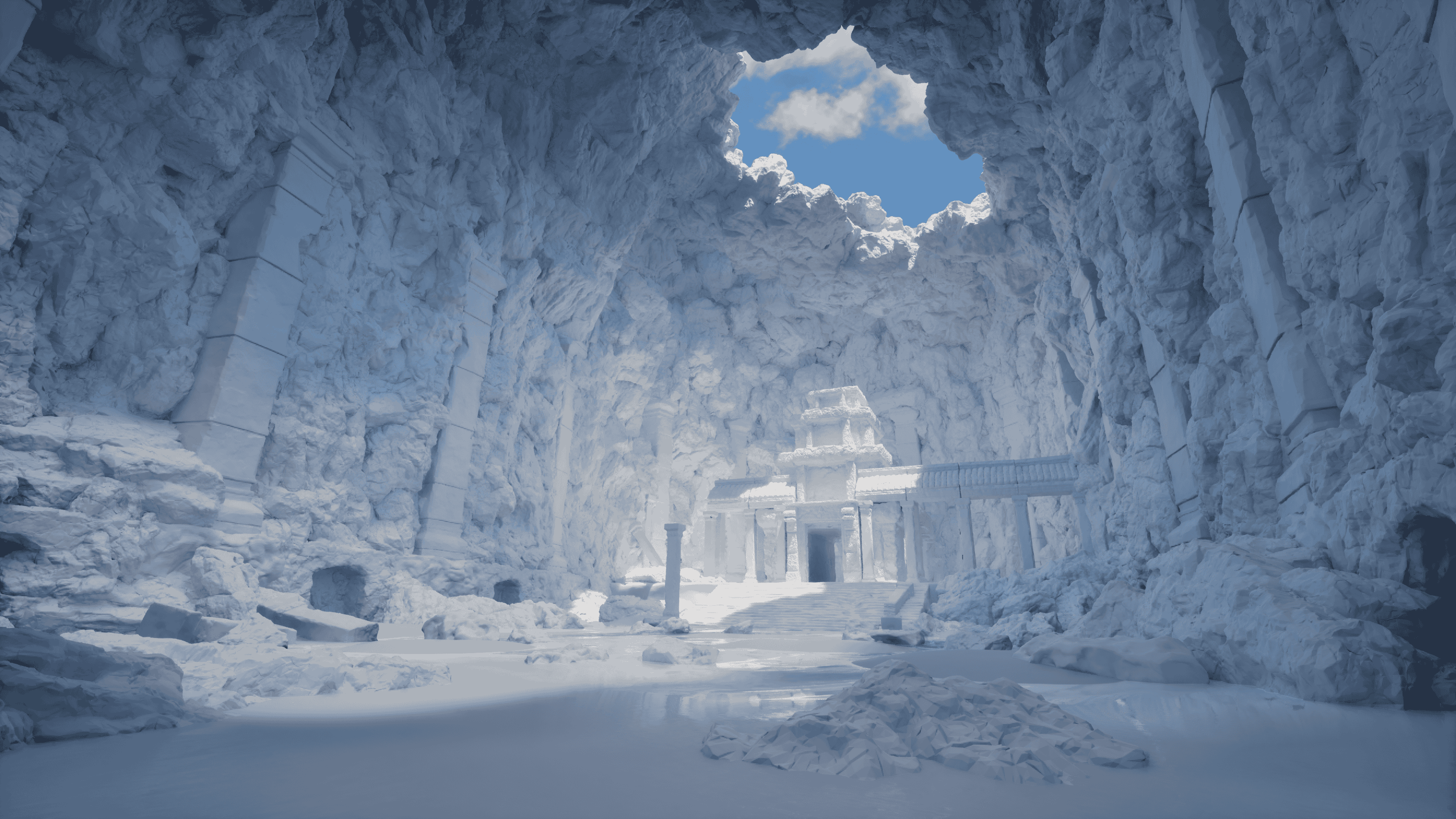 Added Ultra Dynamic Sky, sculpted all cave rocks and pillars, blocked out main temple area (hero asset). I've yet to add a few more Cambodian-inspired models to the temple area, so I may add some statues.