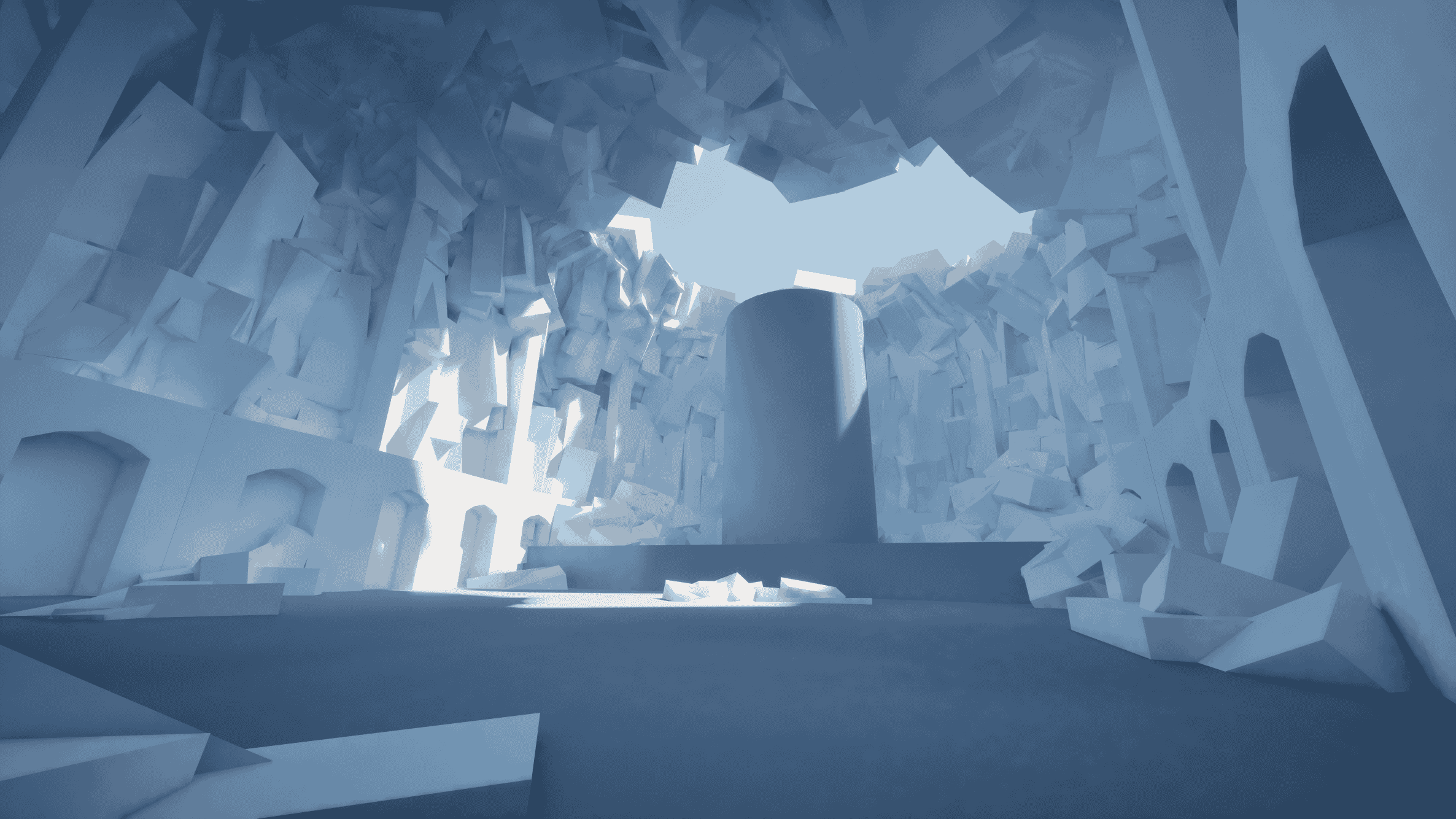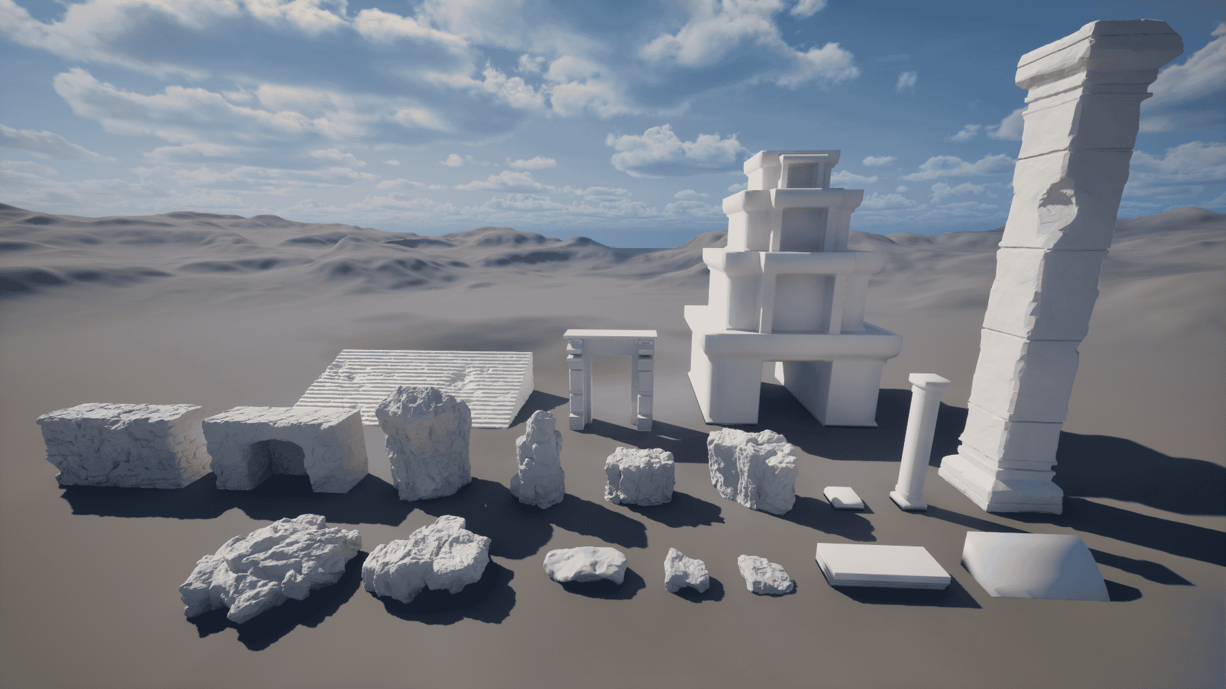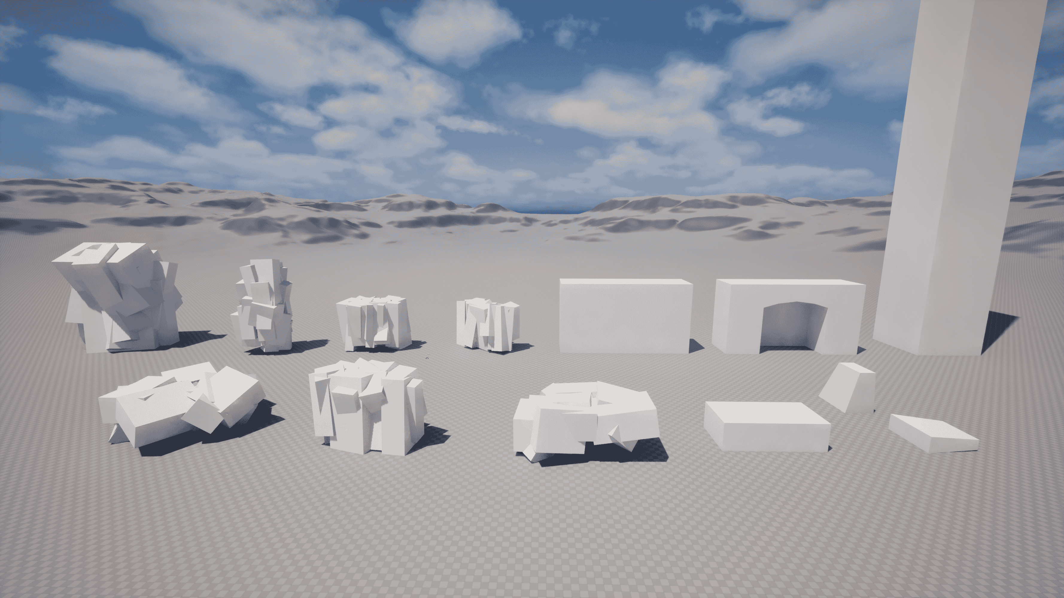 first full greybox test (including a decimated rock model from a HP ZBrush sculpt) to test. Initially I wanted to choose a statue for the hero asset (hence the cylinder), but after a while I changed my mind