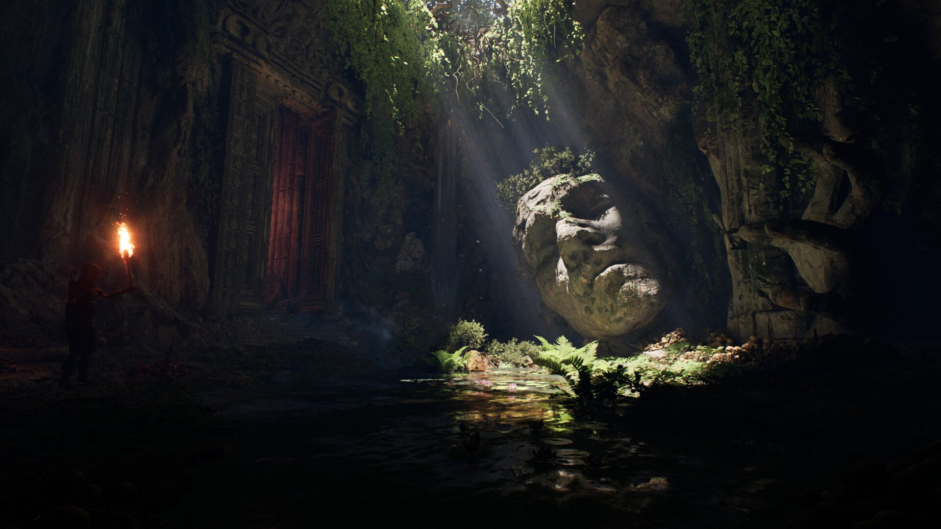 Hi! I’m polishing an Unreal scene (cave ruins with a shallow pond, god rays, big stone head, doorway, torch character). Could you please give me feedback on what to tweak or redo in this Unreal scene so it looks more polished? Thanks in advance!