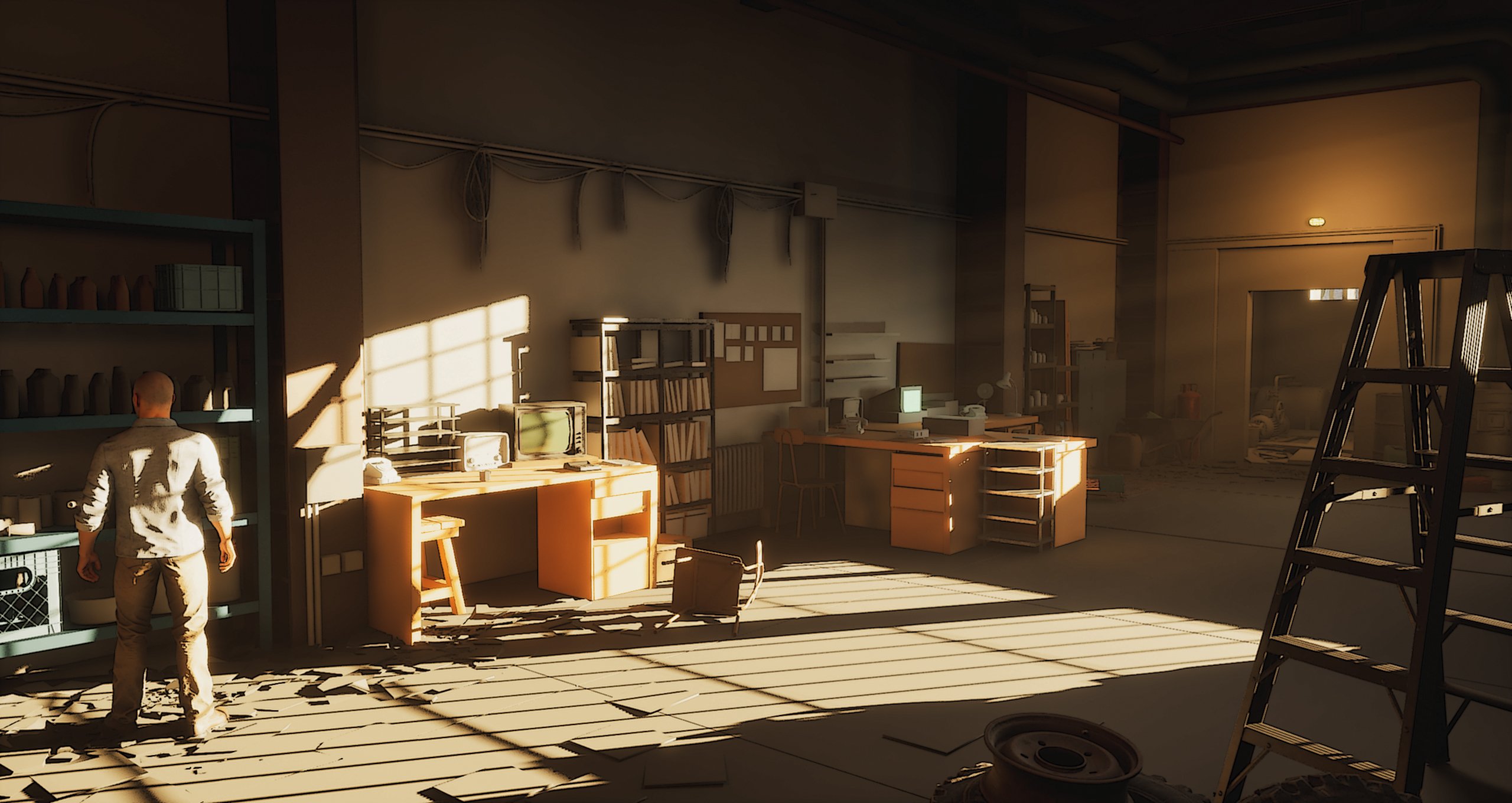 Or have some things hanging from the rafters, maybe tatters of plastic sheeting, moving a little in the breeze. Could be a nice touch to add some life to the scene.
