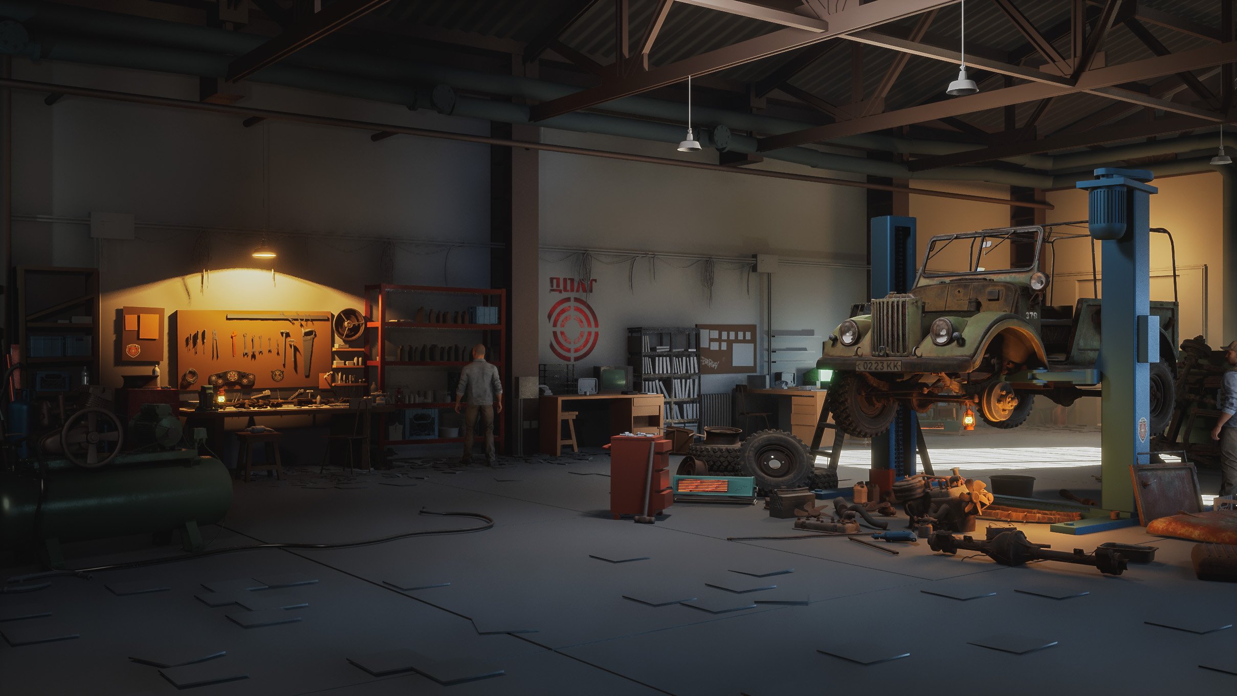 The overall theme is late 70s–80s USSR, so all assets are visually grounded in that period, combined with an industrial warehouse/mechanic environment and military influences.