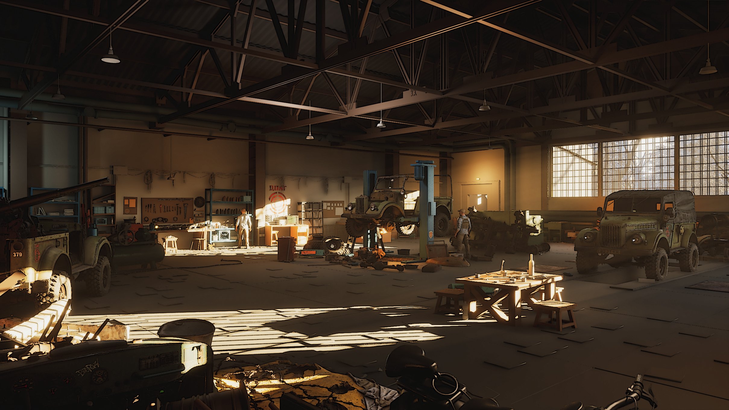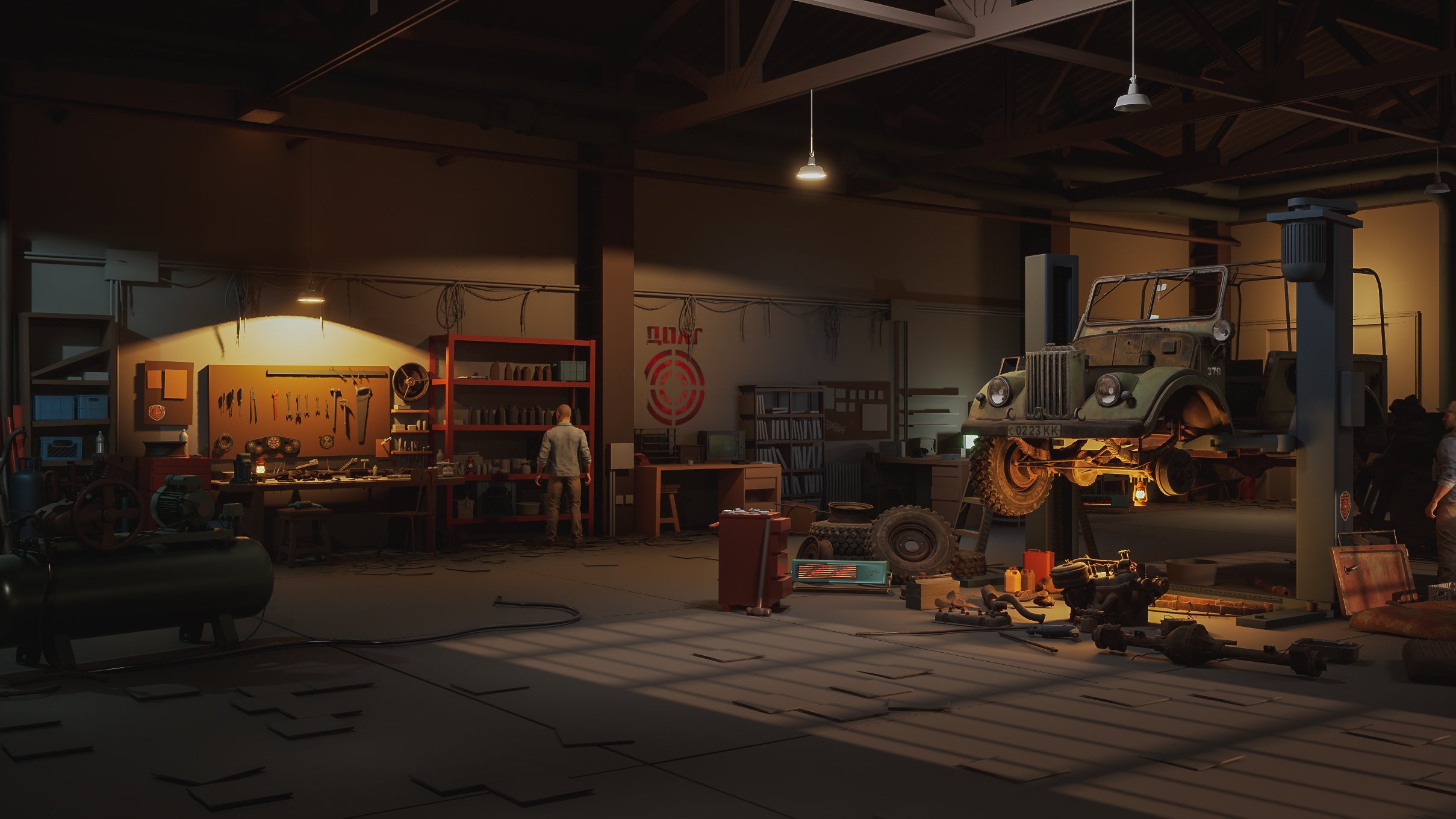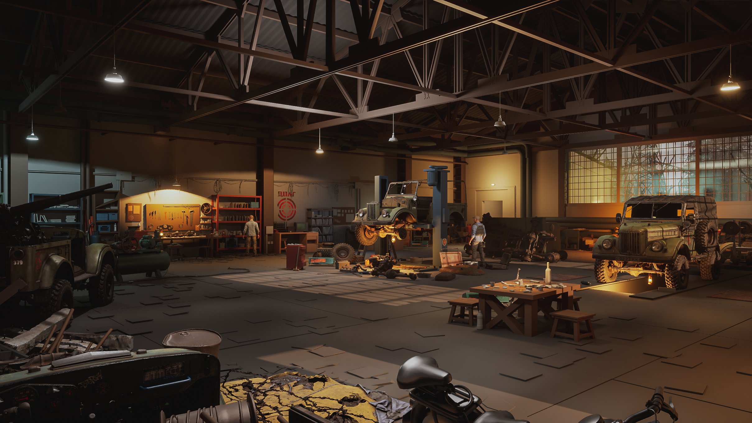 As for storytelling, it’s expressed through the way props are placed and how the space is used. The scene suggests specific activities and narratives—vehicle repair and modification, a warehouse/workshop setup, and elements of military use. Each area hints at what has happened or is still happening there.