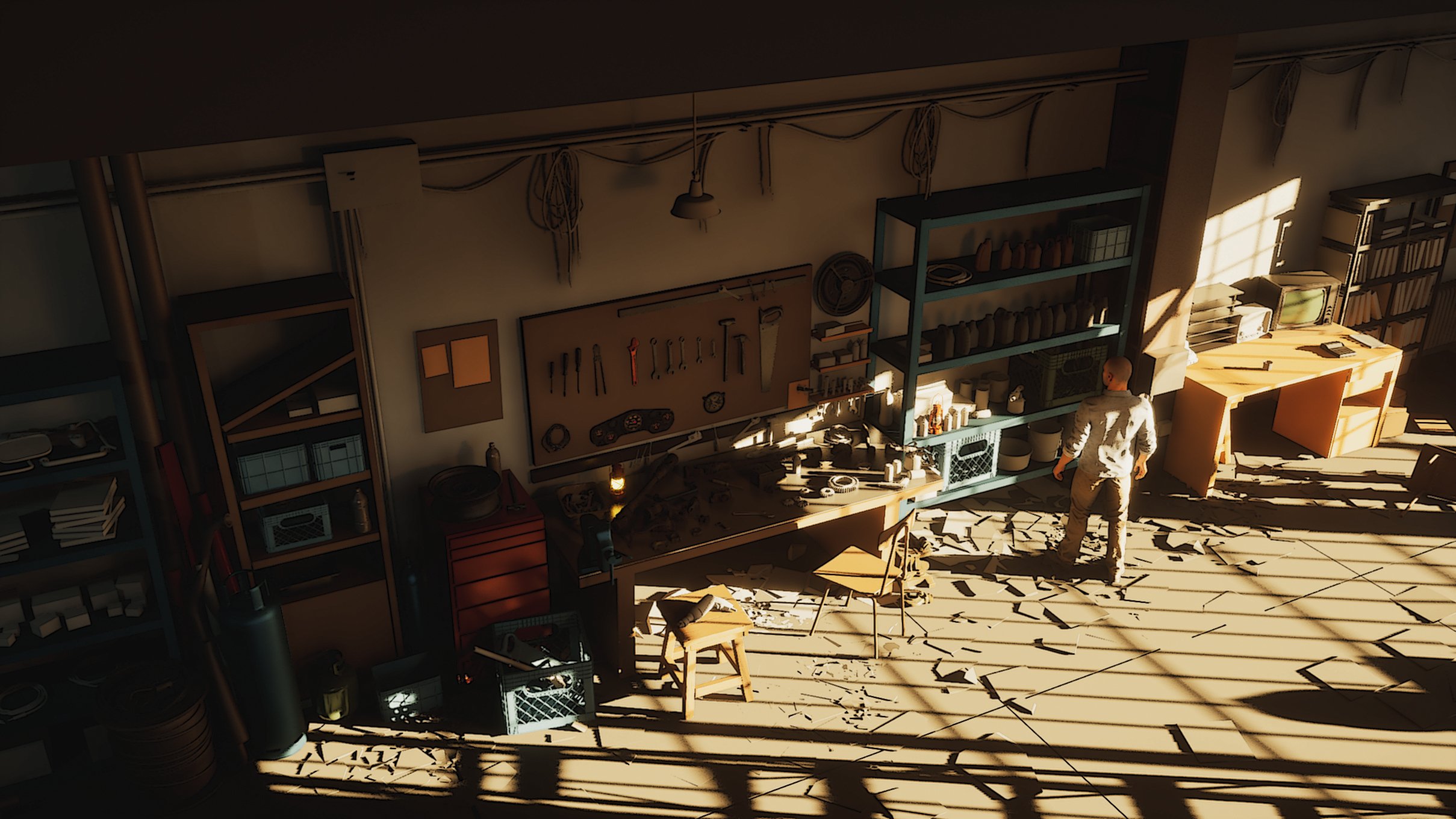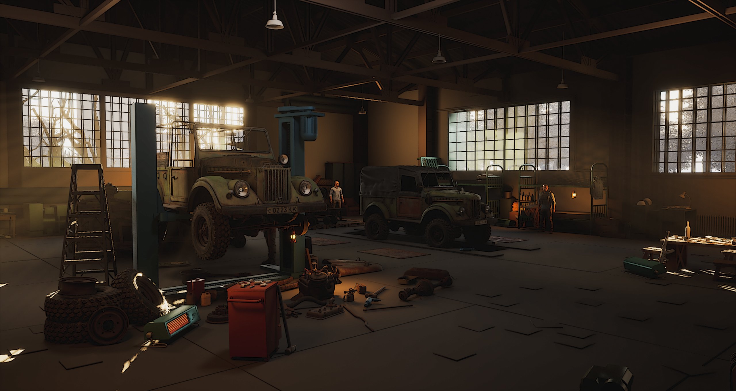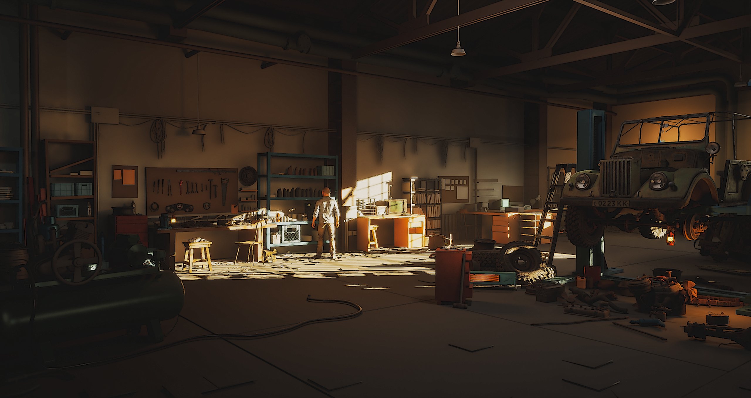 As for storytelling, it’s expressed through the way props are placed and how the space is used. The scene suggests specific activities and narratives—vehicle repair and modification, a warehouse/workshop setup, and elements of military use. Each area hints at what has happened or is still happening there.