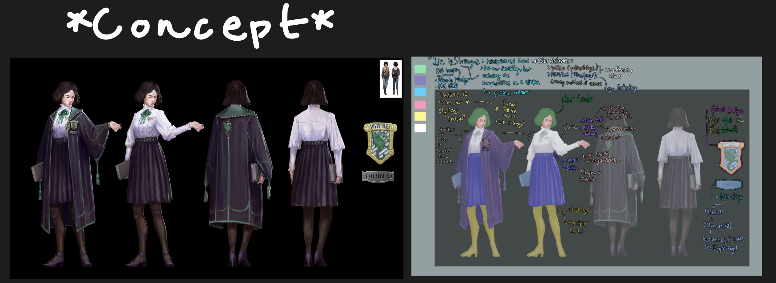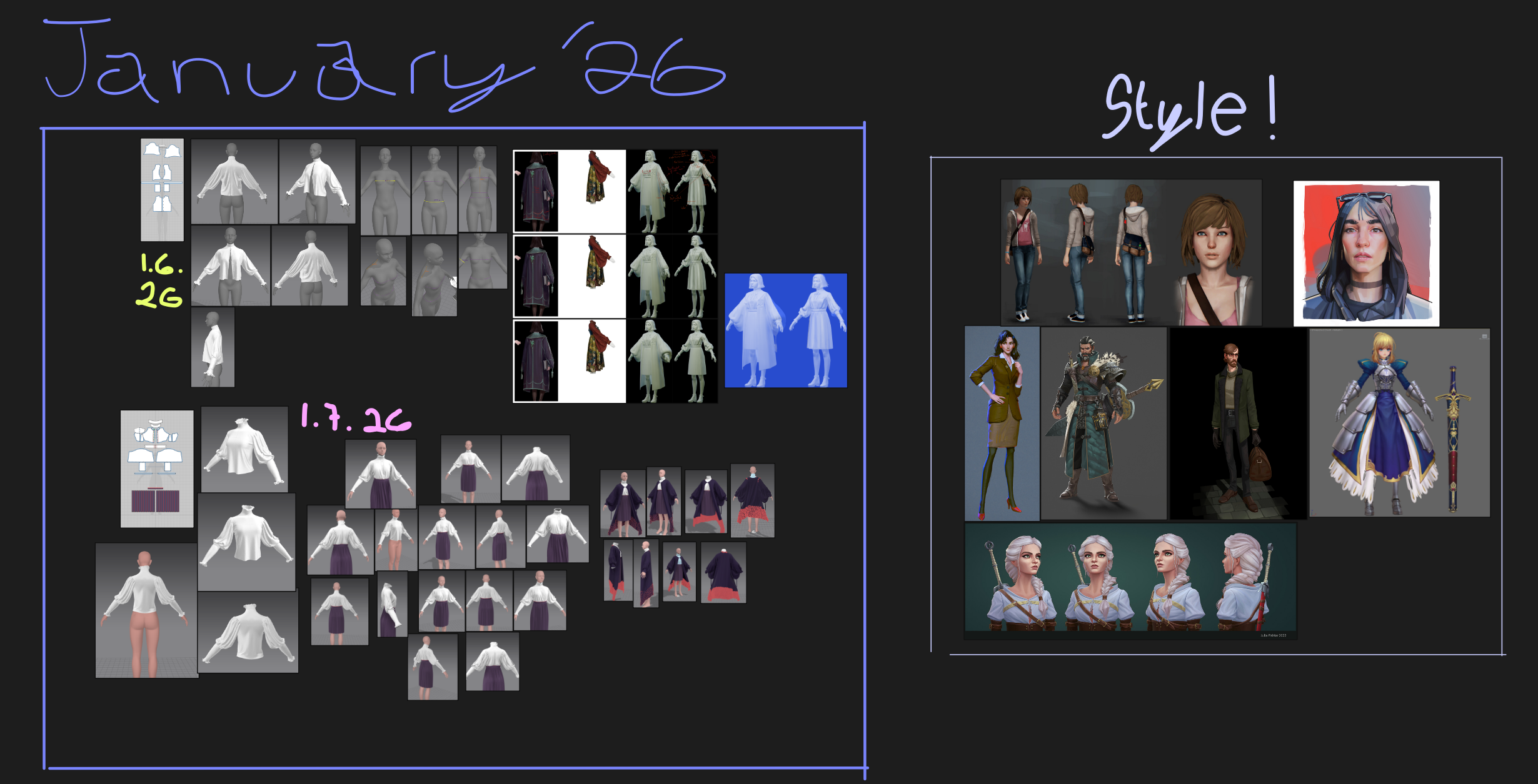 I will be going for a hand-painted PBR style inspired by "Life is Strange (2015)" and "Arcane (2021)", with a focus on game optimization and closely matching the concept. Currently, I am iterating on her clothing in Marvelous Designer and re-modeling her accessories in Blender.