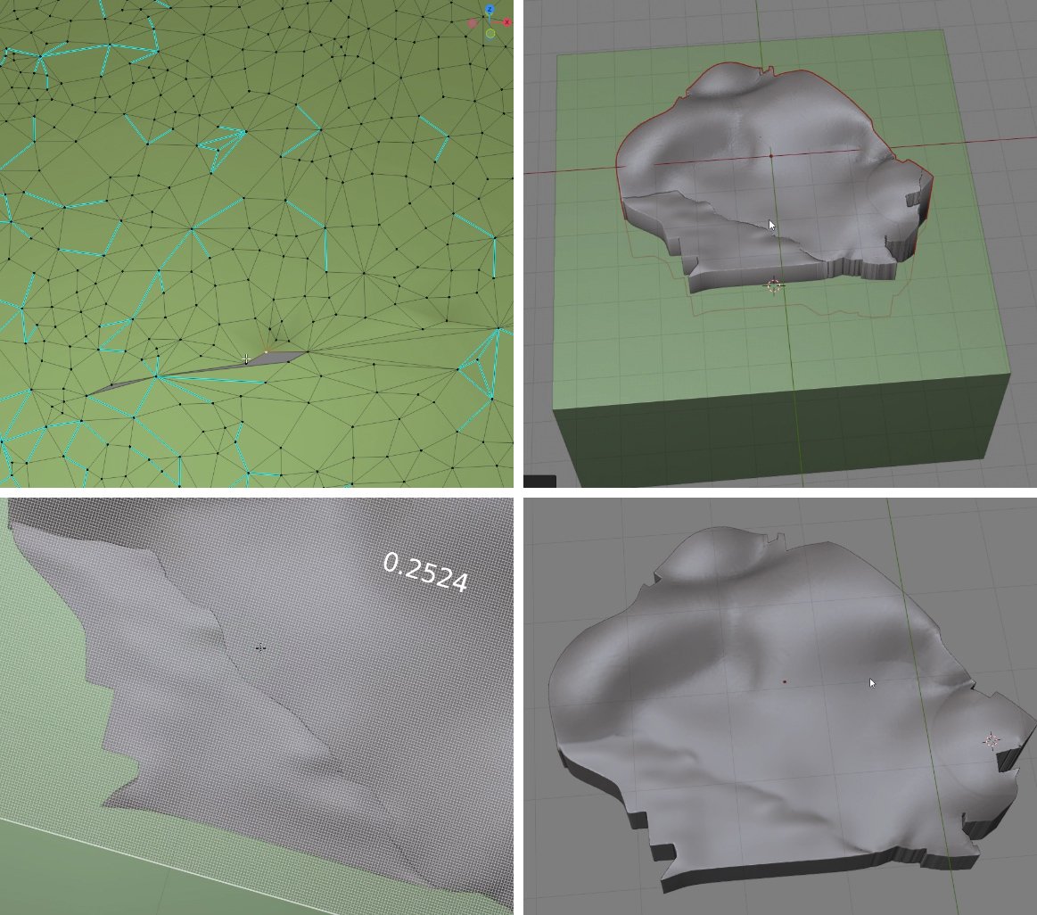 - Step 2 shows the individual thin chunks of terrain being extruded down to create thick slabs. The box under them was just used as a negative Boolean to even/flatten their bottom side, but this could be done with just scaling on Z.