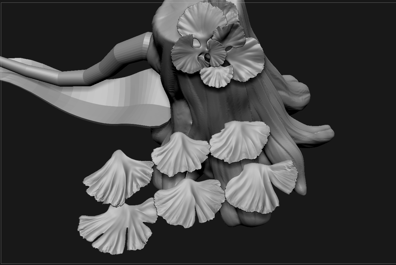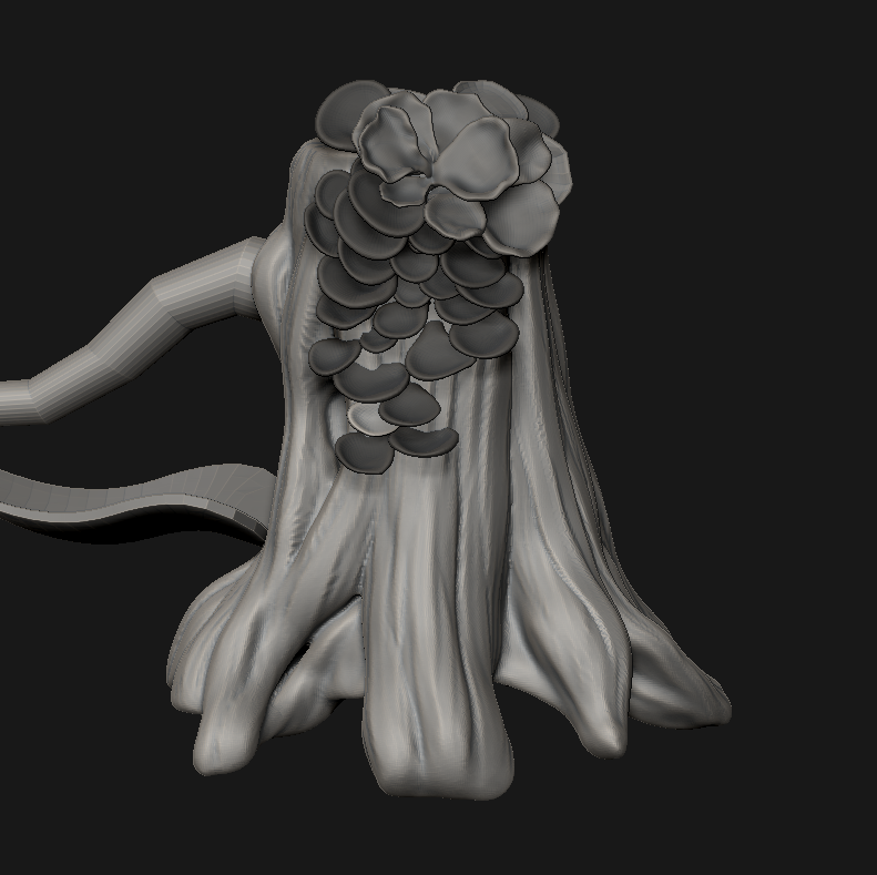 it's been really odd doing this piece, the stump part is a bit strange but i think i got most of it basic shape but the mushrooms i'm still undecided, i did some tests, maybe i should make it more sparse and fewer, i also found this ref that the mushrooms stacked looks like a flower and i really liked it, i would love to see some opinions if i should do this one, the big "mushroom flower" in the back with a few sparse smaller ones