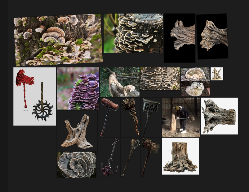 At the moment i'm sculpting this Trunk Hammer, heavily inspired by monster hunter, the head of the hammer is a tree trunk with some turkey tail mushrooms on the back, the handle an ivory tusk of somekind of animal(that's an excuse because there are no animals with this kind of tusk shape) and i'm experimenting with this kind of Shield(?),Handguard(?),Hilt(?) on the front of the hammer
