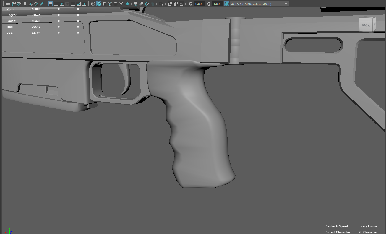 So far I’ve modeled the butt pad, cheek piece, sling points, folding stock, safety, trigger, pistol grip, and part of the main body. I spent some extra time making sure the larger components felt accurate in scale and placement, since those will guide the rest of the build. Right now everything is still fairly simple and functional, just enough geometry to define the forms and test how the pieces fit together.