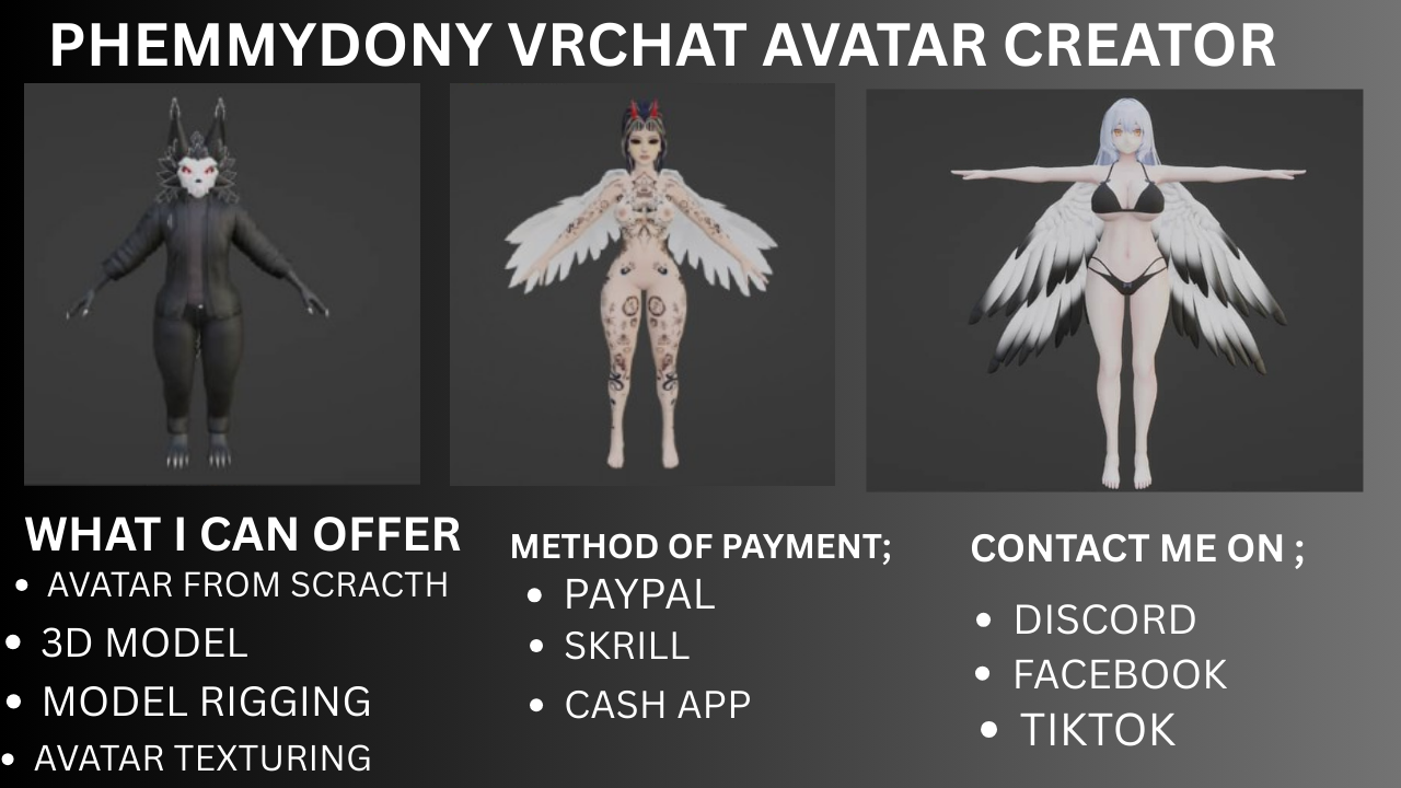 I’m PhemmyDony, a 3D artist specializing in custom VRChat avatar creation. I design and build avatars from scratch with a strong focus on clean topology, proper rigging, and VRChat optimization.