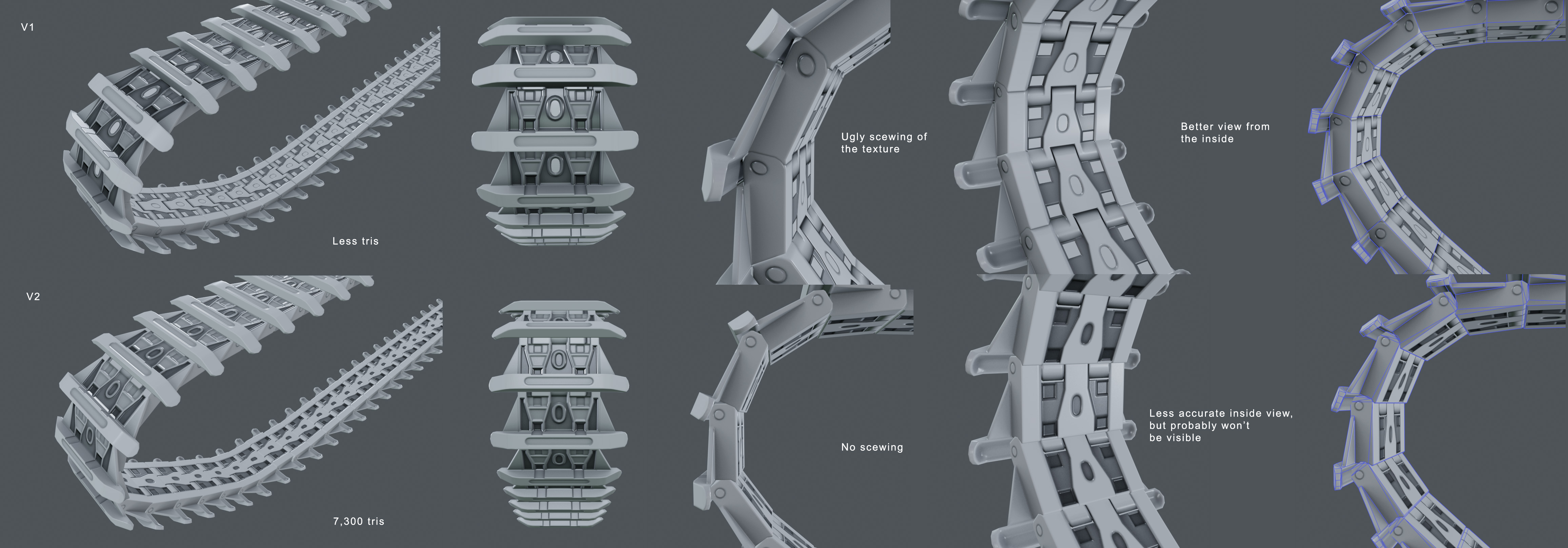 The turret is 5,456 tris so far. The blue parts in the renders are the areas I plan to overlap on the UV. Also the model has temporary cuts right now in the non-visible areas. I did that in order to place some UV shells there and in the final model the cuts are going to be removed.