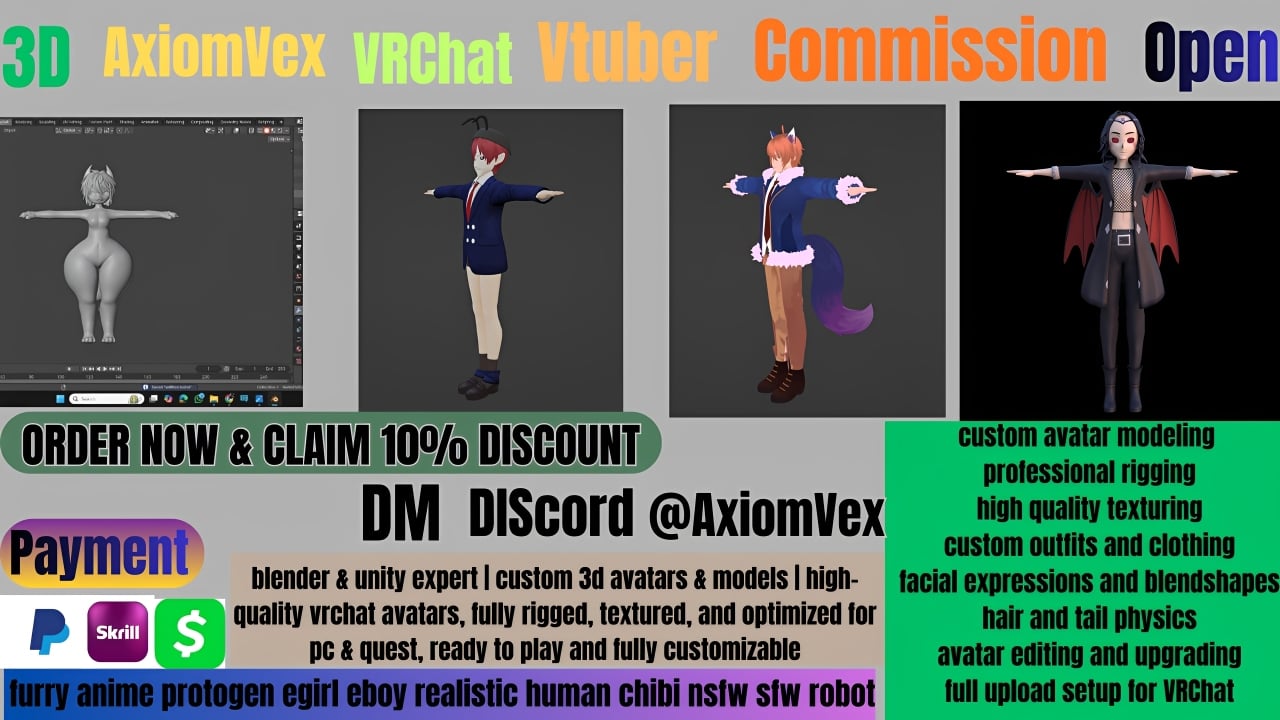Howdy! My name is AxiomVex, a skilled 3D Avatar Artist specializing in VRChat and virtual character creation. I work with industry-standard workflows in Blender and Unity, creating, upgrading, and converting avatars with strong attention to detail and performance.
