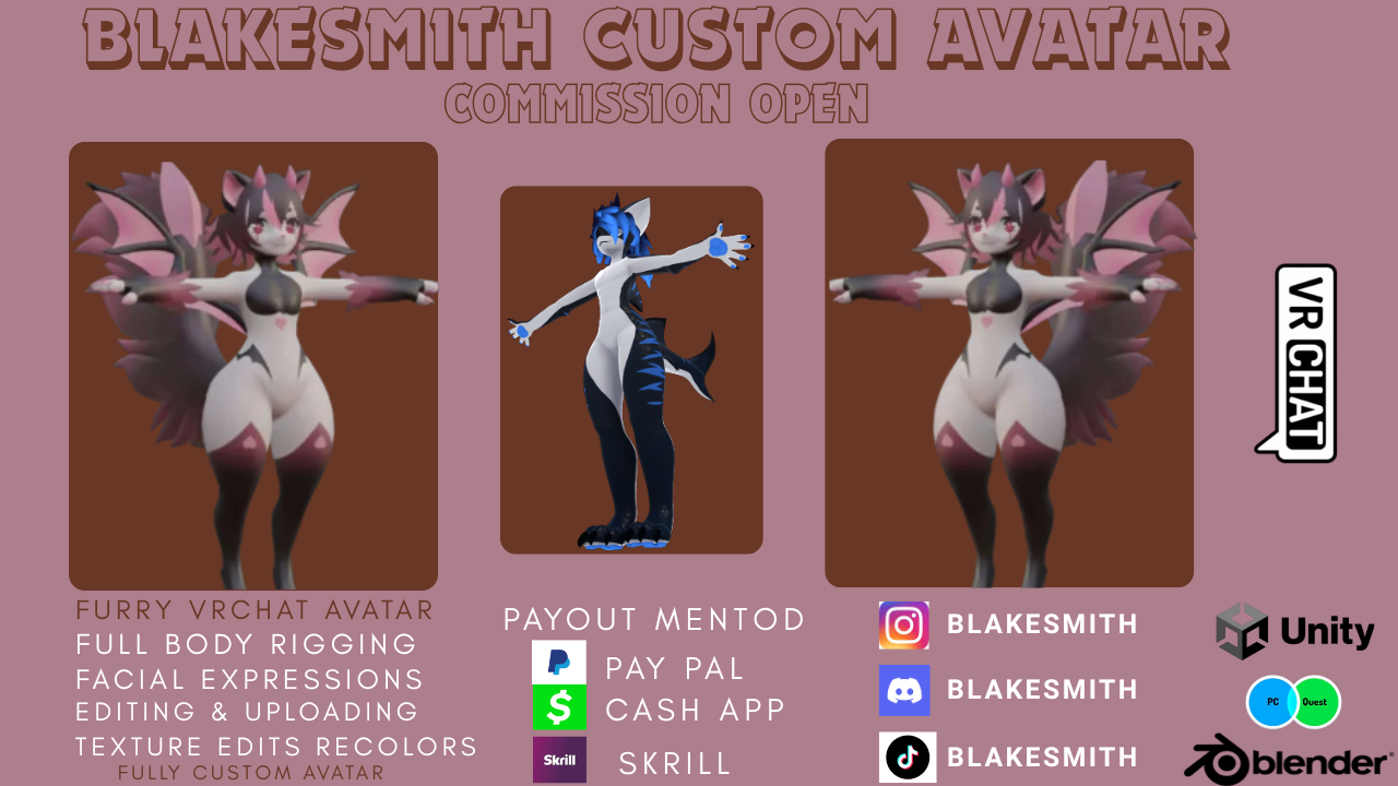 Hello! I’m blakesmith and have been making avatars for 5 years! I can complete a commission in a few days, but it can take up to a few weeks as well if your request is complex. Communication is very much important! I will send frequent updates of your commission when I work on it and will ask for your opinion. I specialize in making avatars from scratch, and my starting price for a full character is +$450 (can change depending on the complexity).