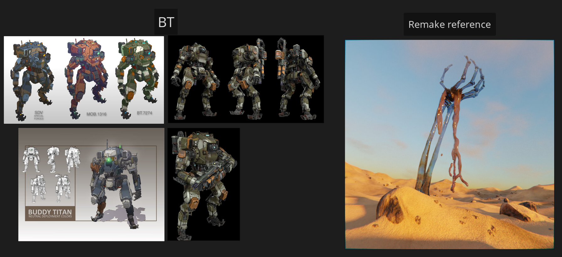 The arm is inspired by an old render I made when I was 17, and will be similarly sticking out of the ground [Remake reference]. I'm going for an arm inspired by BT-7274 from Titanfall 2 as well.