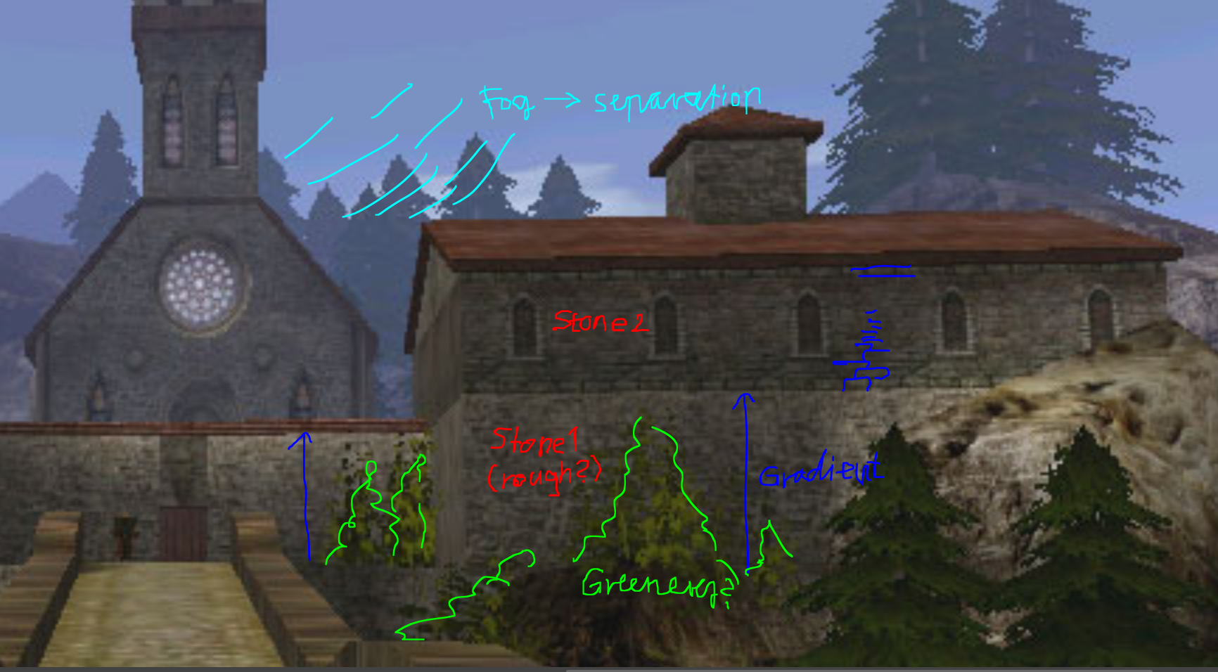 Other than that I would look at the original environment and take some notes, looking for real world references wouldn't hurt either. While the original has low res textures, the environment has variance and organic feel. Looks like different type of building materials are being used and they have some gradients (due to construction, weathering, overgrowth).