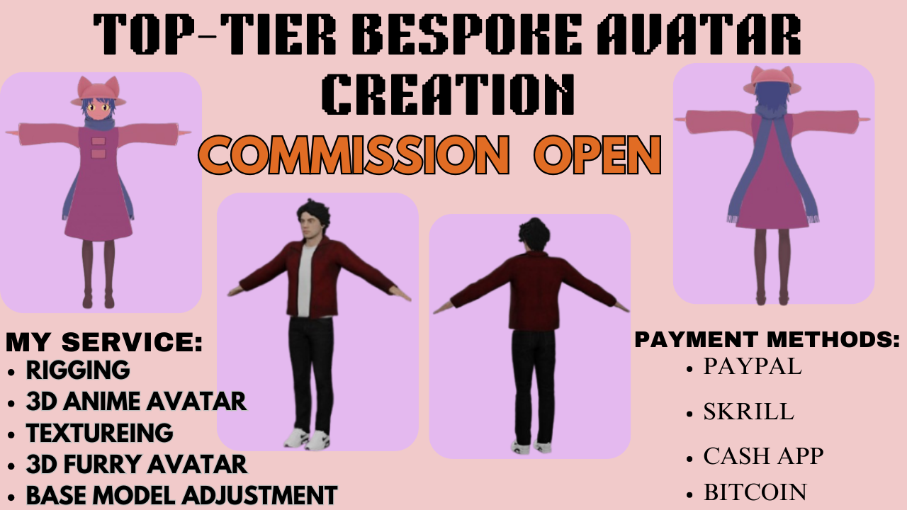 Stand out in VRChat with a fully customized avatar designed just for you. I create high-quality 3D avatars, offer avatar edits and upgrades, partial 2D artwork, and clean, professional reference sheets.